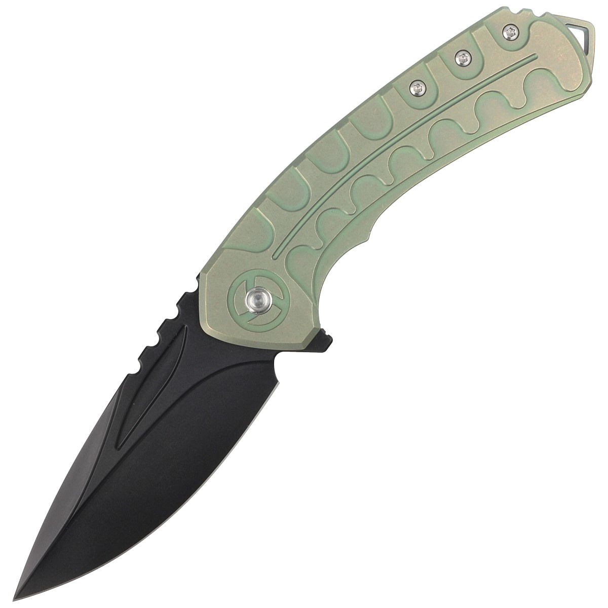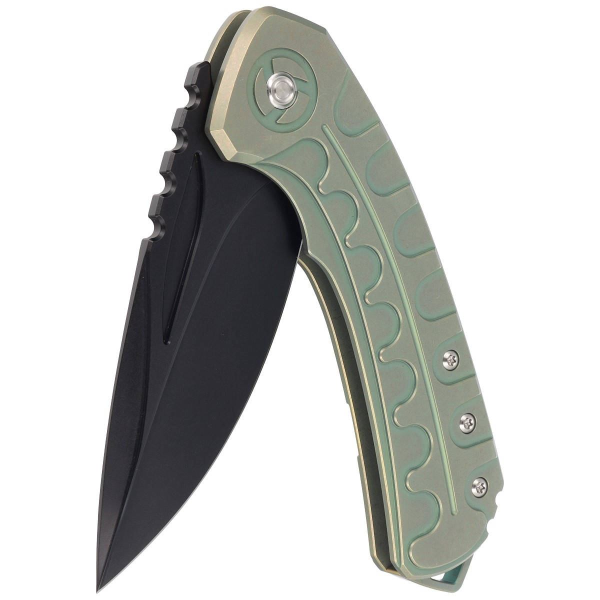 • Buwaya Retro Green Titanium, Black Stonewashed elaborate EDC folder aimed at discerning buyers, design by Polish designer Grzegorz "Kombou" Grabarski and Bestech Knives company. Intricately decorated handle, excellent blade steel!!!