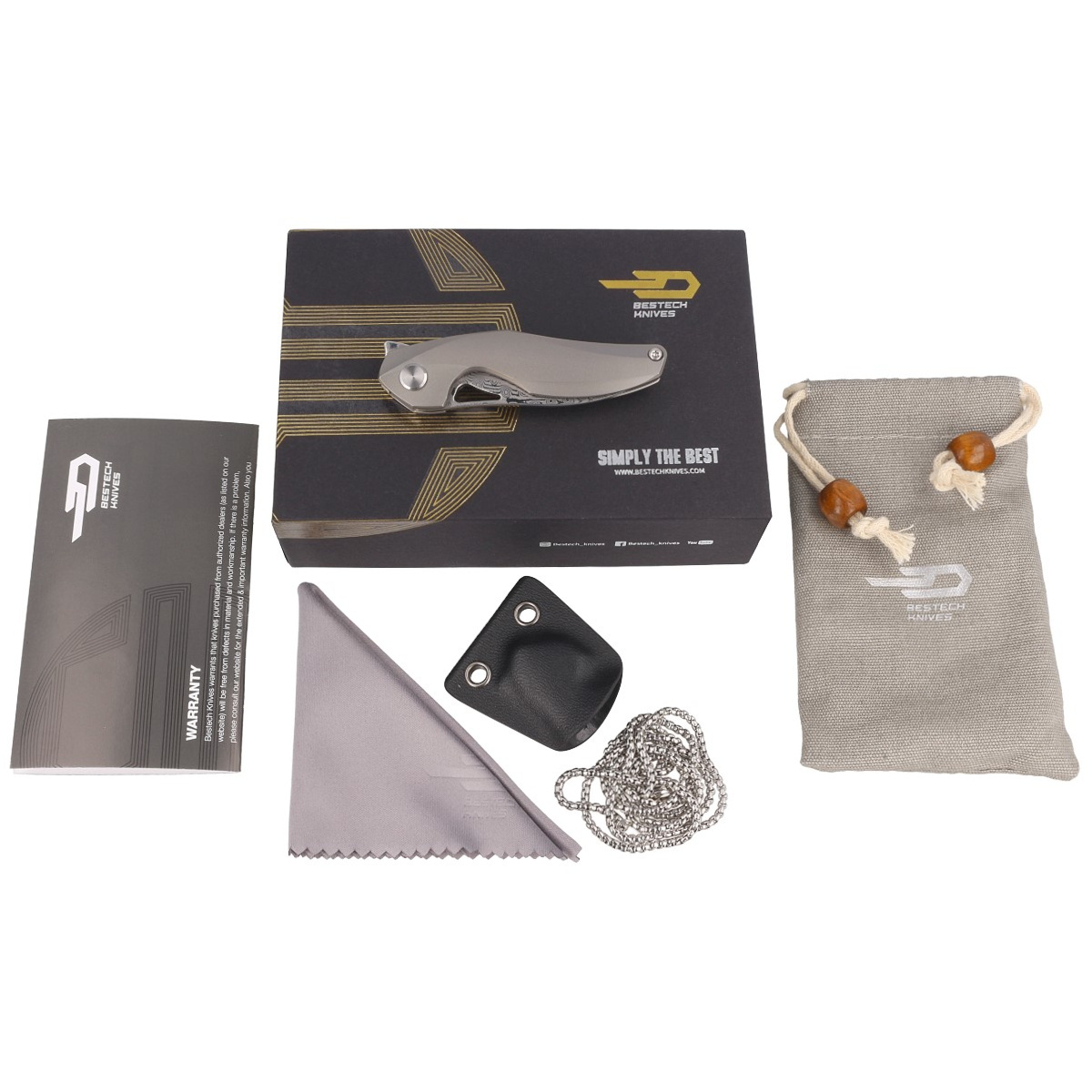 Handle - made of solid titanium 6AL4V. Chamfered cover edges eliminate sharp edges for comfort and improve grip security. The solid titanium backspacer to which the grips are attached guarantees the rigidity and strength of the entire structure. A deep finger undercut (fore finger groove) improves grip confidence. A single-position, right-hand titanium clip allows the knife to be carried in tip-up position, with the tip of the blade upward.
