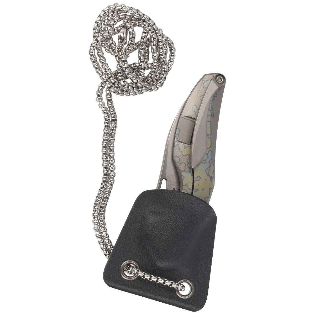 The Reticulan Grey / Colorful Titanium, Stonewash / Satin an undersized elegant folding knife with a scabbard suitable for hanging around the neck. Designed by renowned knifemaker and designer Elijah Isham. The appearance of The Reticulan clearly highlights Elijah Isham's design style. His designs are often enhanced with artistic organic shapes and wavy lines. Without a doubt, The Reticulan is an extraordinary knife that will make you stand out from the crowd!