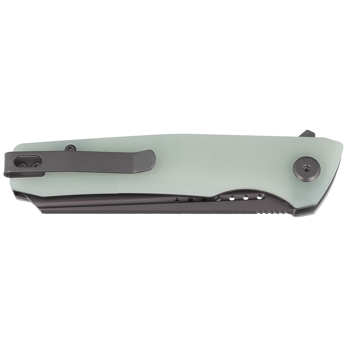 Handle - scales made of G10, practically indestructible plastic insensitive to weather conditions, resistant to chemicals and mechanical damage. The chamfered edges of the covers eliminate sharp edges and the textured surface improves grip confidence. The backspacer also made of G10, to which the grips are attached, guarantees the rigidity and strength of the entire structure. A single-position, right-handed deep-carry clip allows the knife to be carried in the tip-up position, with the tip of the blade upward.