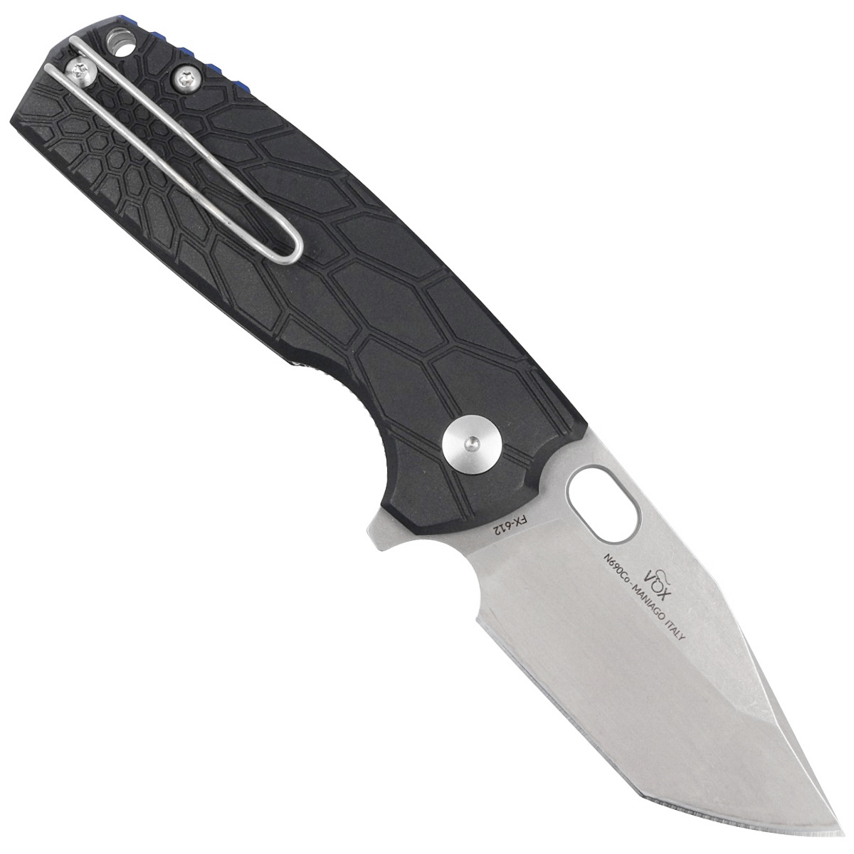Handle - liners made of FRN (Fiberglass Reinforced Nylon), a lightweight material, insensitive to weather conditions, resistant to chemicals and mechanical damage. Chamfered edges of the covers eliminate sharp edges and surface texturing improves grip security. The solid backspacer to which the facings are attached guarantees the rigidity and strength of the entire structure. A two-position (right/left) lightweight wire clip allows the knife to be carried in tip-up position, with the tip of the blade upward. Above the clip a hole for threading a safety or decorative cord.