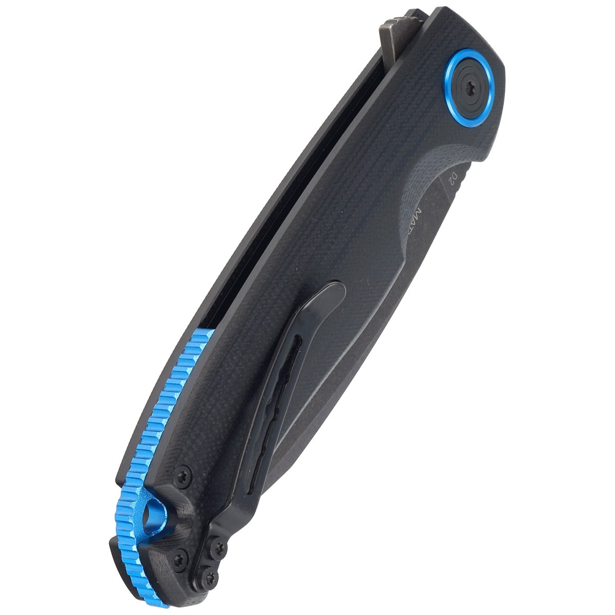 Handle - grips made of G10, a practically indestructible plastic insensitive to weather conditions, resistant to chemicals and mechanical damage. Chamfered edges of the covers eliminate sharp edges and surface texturing improves grip confidence. The massive backspacer to which the grips are attached guarantees the rigidity and strength of the entire structure. The pivot axis decorated with a blue anodized ring, in the same color of the backspacer. A single-position (right) deep-carry clip allows the knife to be carried in tip-up position, with the tip of the blade upward. Above the clip a hole for threading a safety or decorative cord.