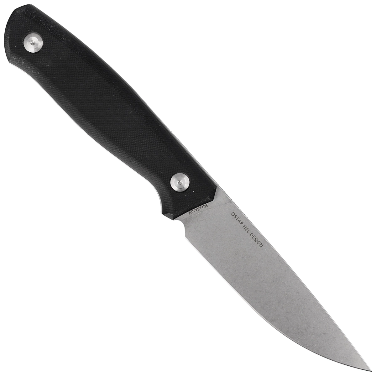 Handle - G10, (pressure-pressed fiberglass with synthetic resin) grips profiled for improved grip confidence, screwed directly to the tang. They provide excellent ergonomics and a secure grip. A deep, profiled finger undercut (fore finger groove) prevents the hand from accidentally slipping on the blade. In the back, characteristic of Ostap's designs, there is a hidden place for threading a safety or decorative cord.