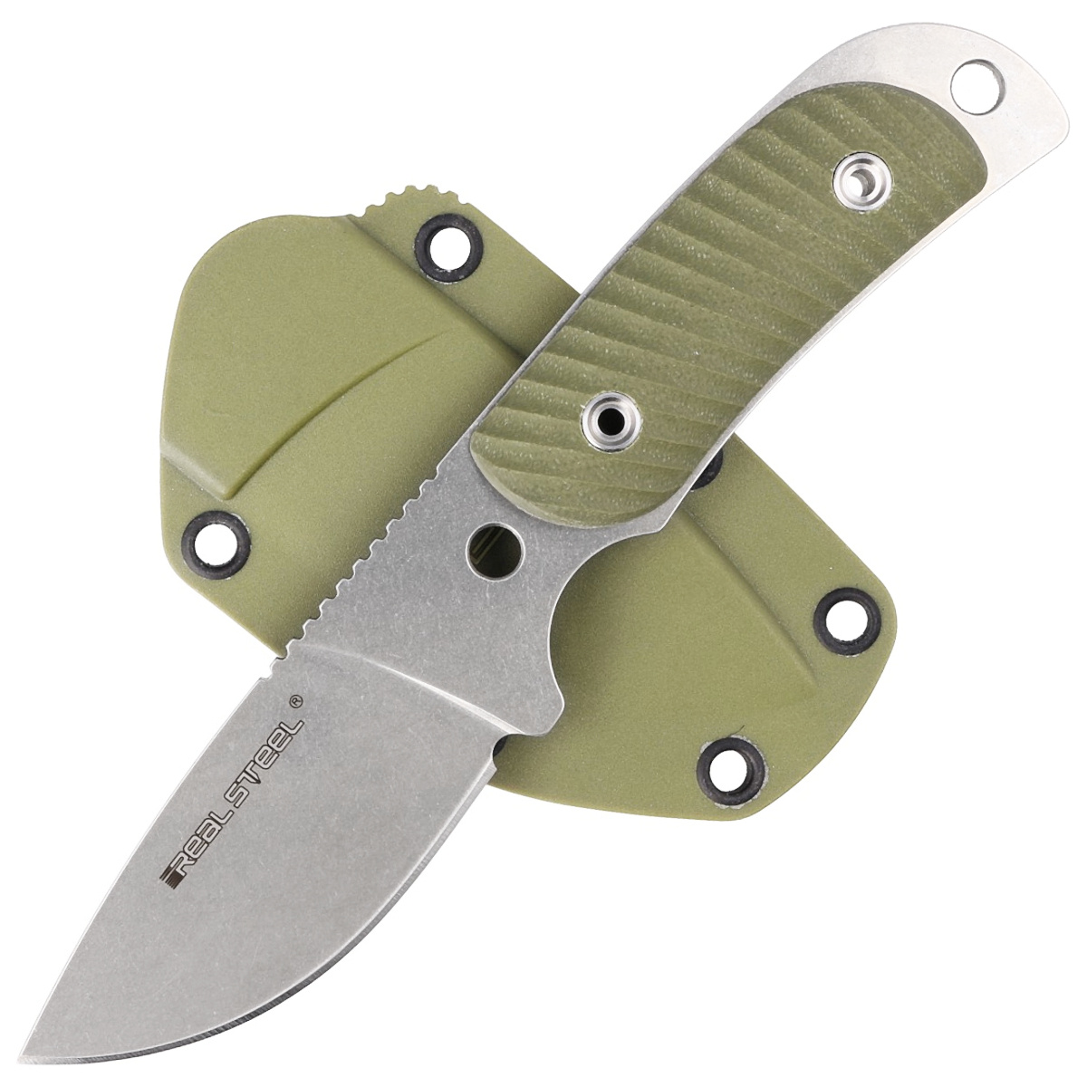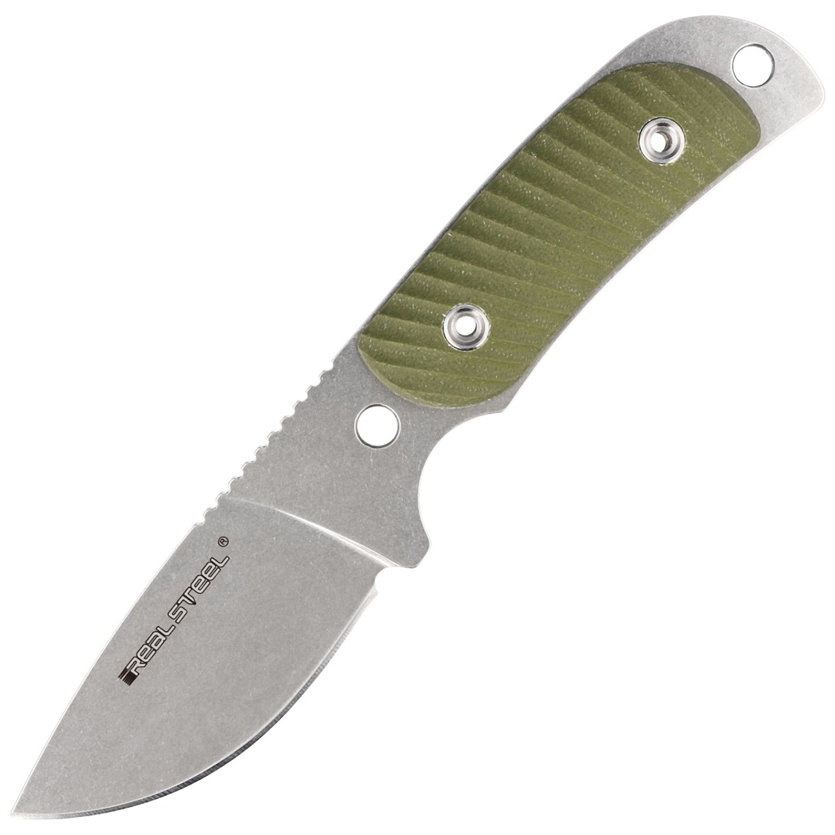 - Hunter 165 Green G10, Stonewashed, Real Steel manufactory's all-purpose knife for off-road expeditions. 12C27 stainless steel, comfortable textured G10 grips, plastic sheath with multi-position attachment. An outdoors mate that will not disappoint!