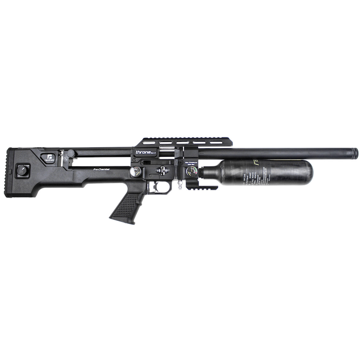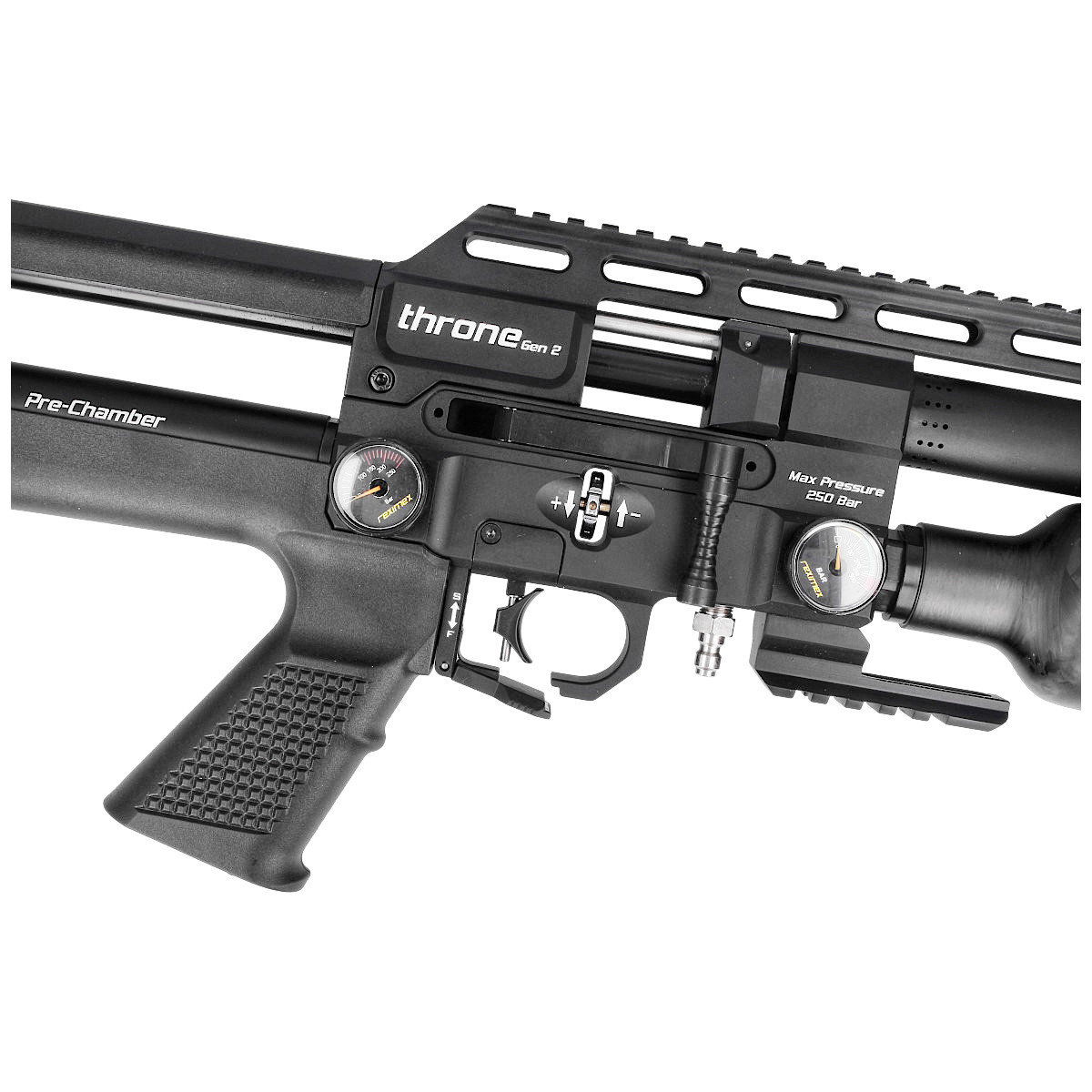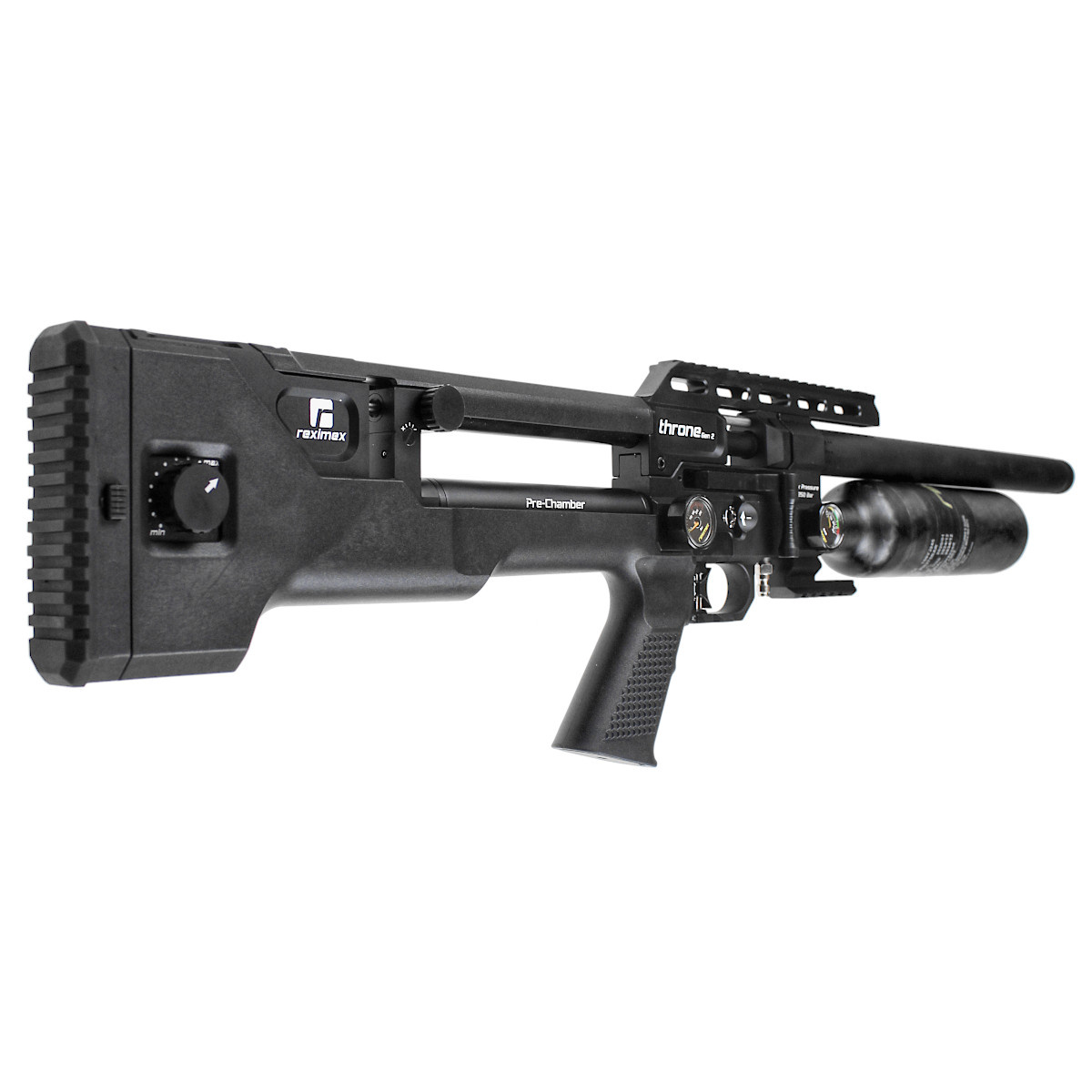 - Reximex Throne Gen2 Carbon, a state-of-the-art PCP rifle with lightweight carbon fiber cartridge, Side Lever reloading lever, firing power regulator, trigger mechanism adjustment knob and barrel with integrated suppressor. Kal 4.5mm, 5.5mm, 6.35mm