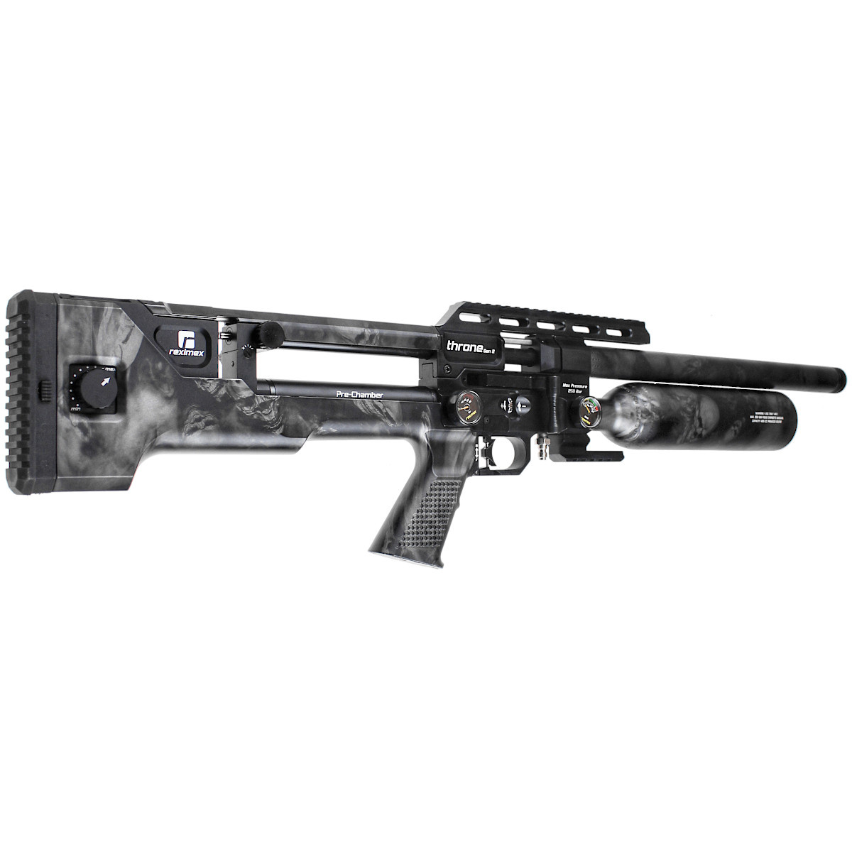 - Reximex Throne Gen2 SKULL Camo, a state-of-the-art multi-shot PCP rifle with Side Lever reloading, firing power regulator, trigger mechanism adjustment knob and barrel with integrated suppressor. Available in calibers: 4.5mm, 5.5mm, 6.35mm