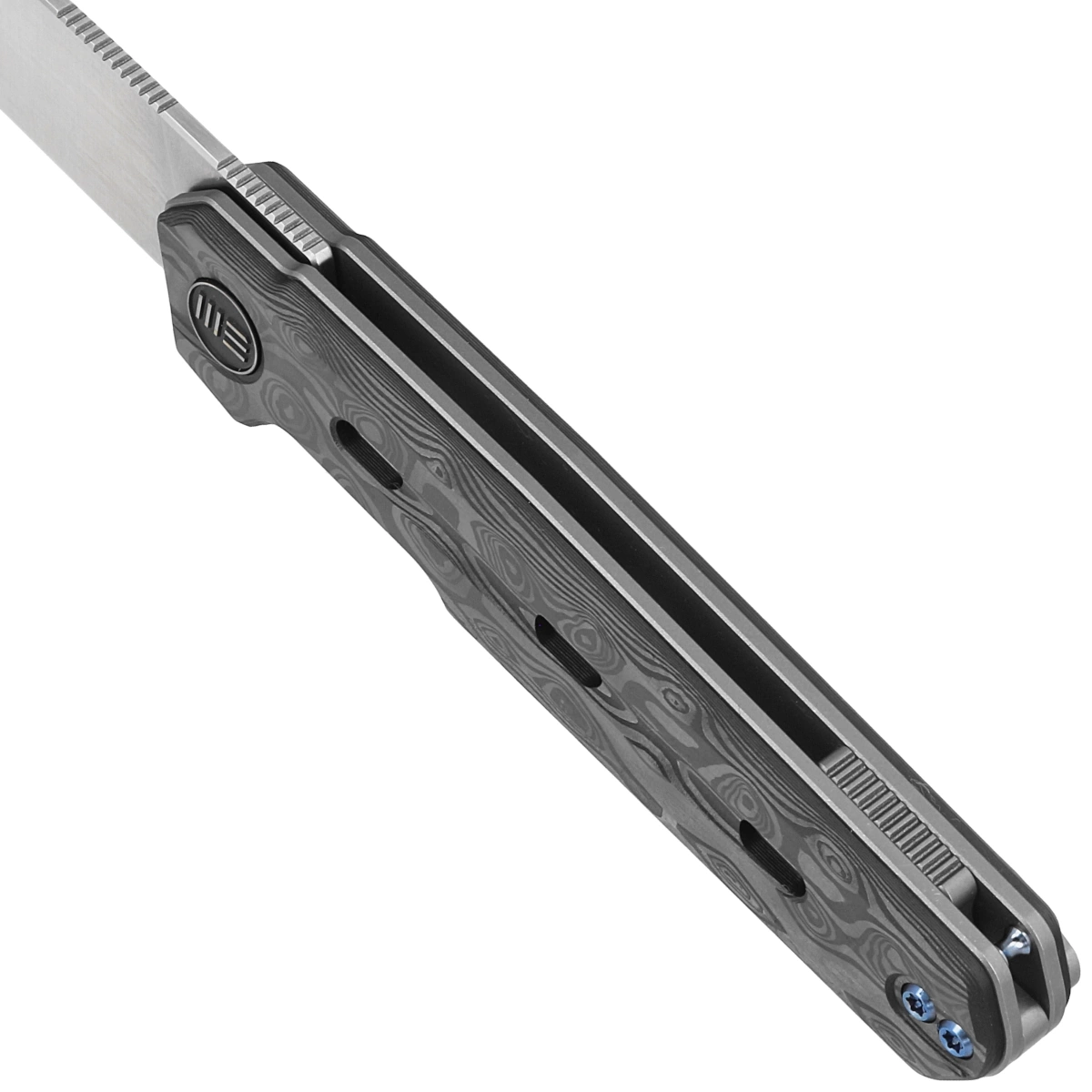 Handle - grips made of Rose Carbon Fiber, (carbon fiber pressed under pressure with synthetic resin) attached to liners made of 6AL4V titanium. Chamfered edges of the liners eliminate sharp edges. The grips are screwed to an intricately machined titanium backspacer, giving assurance of many years of use. The pivot axis is decorated with a stylized WE Knife brand logo. A two-position (right/left) titanium deep-carry clip allows you to carry the knife discreetly in your pocket in the tip-up (blade tip up) position. On the back of the Handle a lanyard hole, hidden in the backspacer, a place for a decorative or safety line.