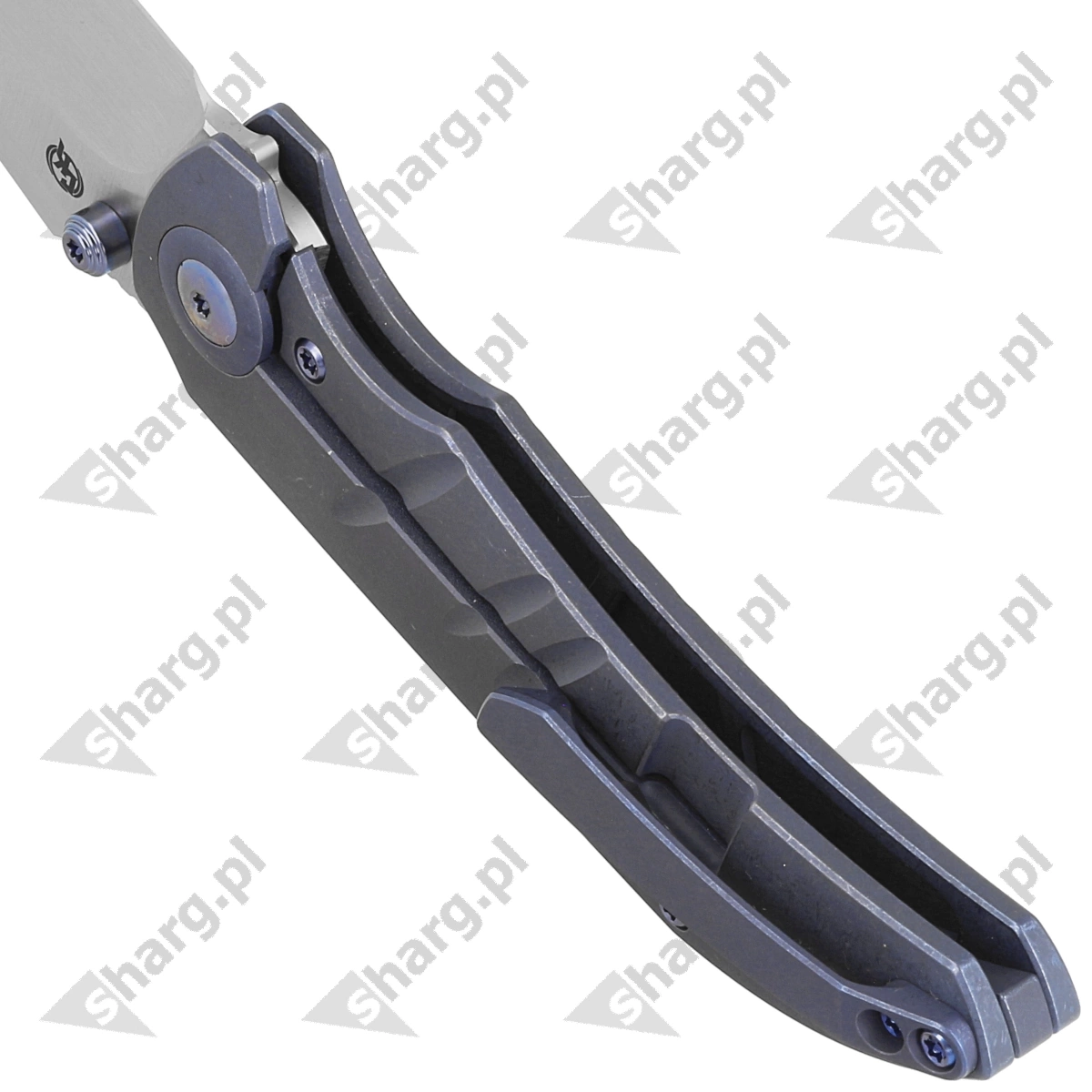 Handle - made of 6AL4V titanium anodized in blue. Contouring of the covers eliminates sharp edges. The grips are connected to each other with a titanium backspacer. The upper part of the backspacer with widely spaced "teeth". Texture and milling of the surface improve grip security. The simplicity and robustness of the design give confidence in many years of use. Single-position clip (right), made of titanium, allows carrying the knife in tip-up position.