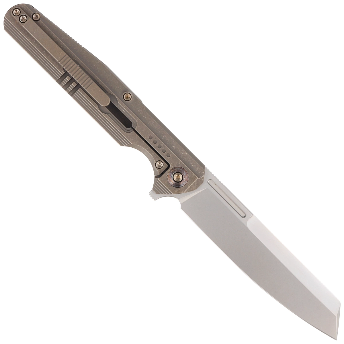Handle - is thick pieces of titanium 6AL4V, beautifully milled in geometric patterns. Only a few companies are able to make the Handle with such incredible accuracy! Joined together using a titanium backspacer. The simplicity and solidity of the construction give the assurance of many years of use. The single-position clip (right), made of titanium, allows the knife to be carried in tip-up position. As in other models, the pivot axis is decorated with a stylized logo of the manufacturer.
