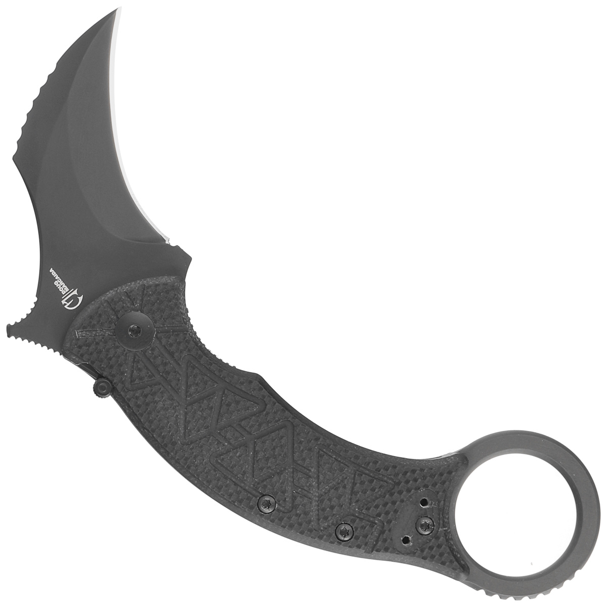 • Tribal K Black G10, Black Top Shield modern folding karambit designed by Doug Marcaida, master of Filipino martial arts. Black coated N690 steel blade, grooved finger ring, G10 grips, a tool that will not disappoint!