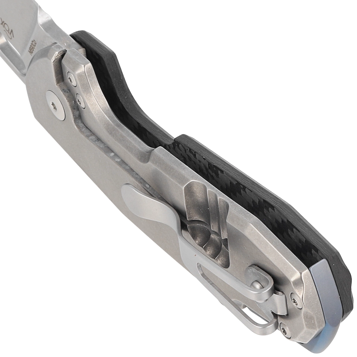 Handle - on one side a thick piece of black Carbon Fiber (carbon fiber compressed under pressure with synthetic resin), and on the other a solid titanium grip. The covers were bolted to a CNC-milled blue anodized titanium backspacer, which translates into the virtually indestructible nature of such a design. A right- and left-handed, two-position deep carry clip allows the knife to be carried discreetly in the tip-up (blade tip up) position. At the end of the Handle lanyard hole, a hole for a rope.