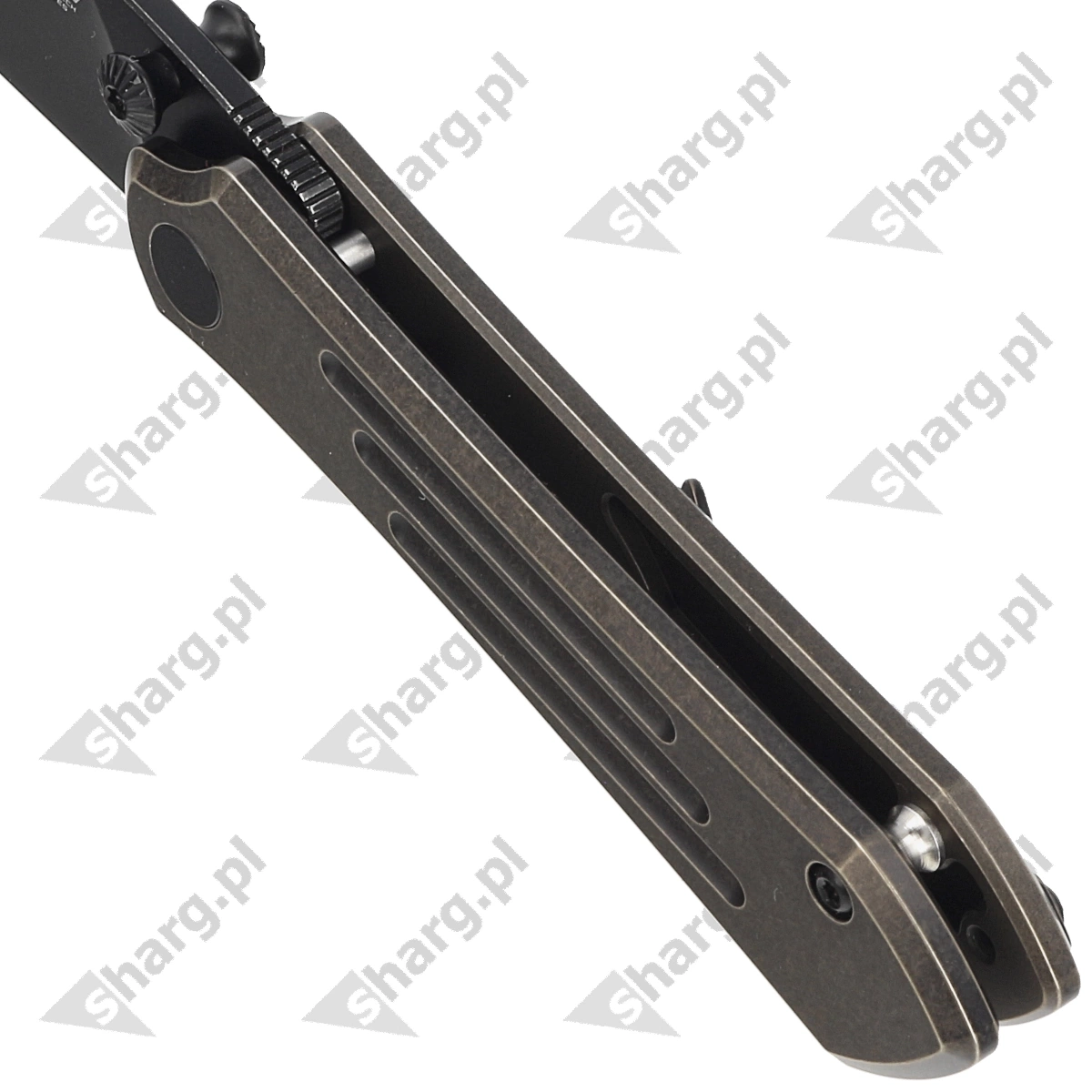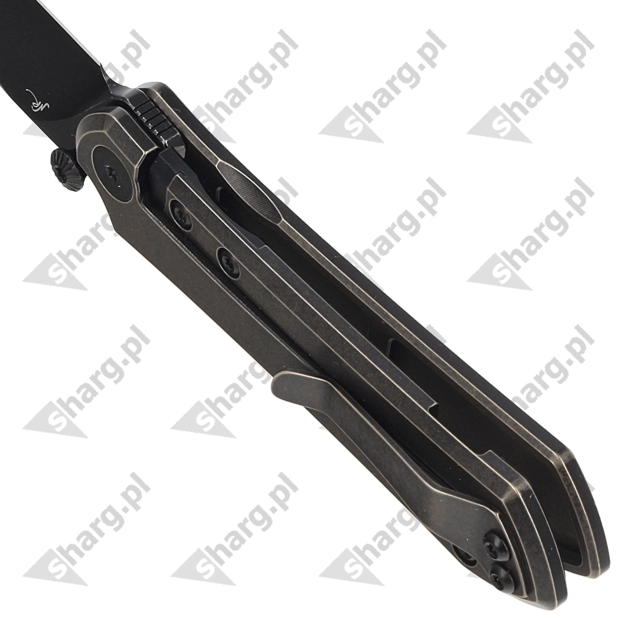 Handle - is two pieces of solid titanium 6AL4V finished in Black Stonewashed method with striking abrasions on the edges, from under which the bronze finish shines through. Ergonomically profiled, they eliminate sharp edges for comfort, notches made in the grips improve grip security. Open-backed design without the typical backspacer, fastened together with steel spacer sleeves for easy cleaning. A single-position, right-handed titanium clip allows you to carry the knife in tip-up position, with the tip of the blade upwards.