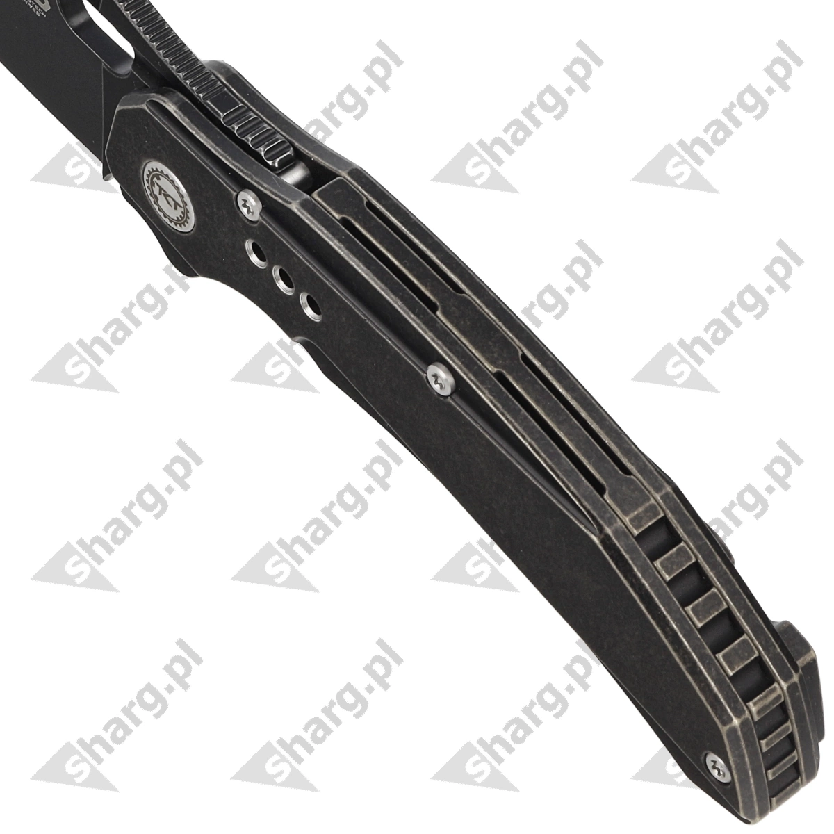Blade - wide, Spear Point type with a scratch-masking Stonewashed finish which has been black coated. The generous belly extends the length of the cutting edge in relation to the length of the blade converging towards the needle-sharp tip of the knife. The thickness of the blade provides high strength while the high, flat grind gives excellent cutting edge geometry and extreme cutting performance. Additional reinforcement is provided by the long grain. Ball bearing ceramic supports the opening of the blade with a fast front flipper (index-finger front flipper). We can also open the knife using a hole in the wedge (thumb hole). The whole thing is locked with a proven and popular frame lock with a steel insert to prevent wiping of the lock face.