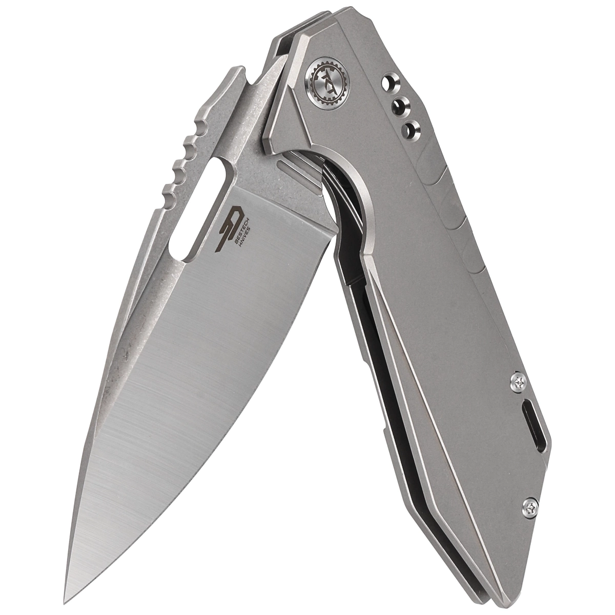 Shodan Grey Titanium, Stonewash / Satin, one of Bestech's flagship knives, designed by Todd Knife and Tool. A large, extremely sturdy folder that will perform well in both EDC applications and heavier field work! Bestseller!