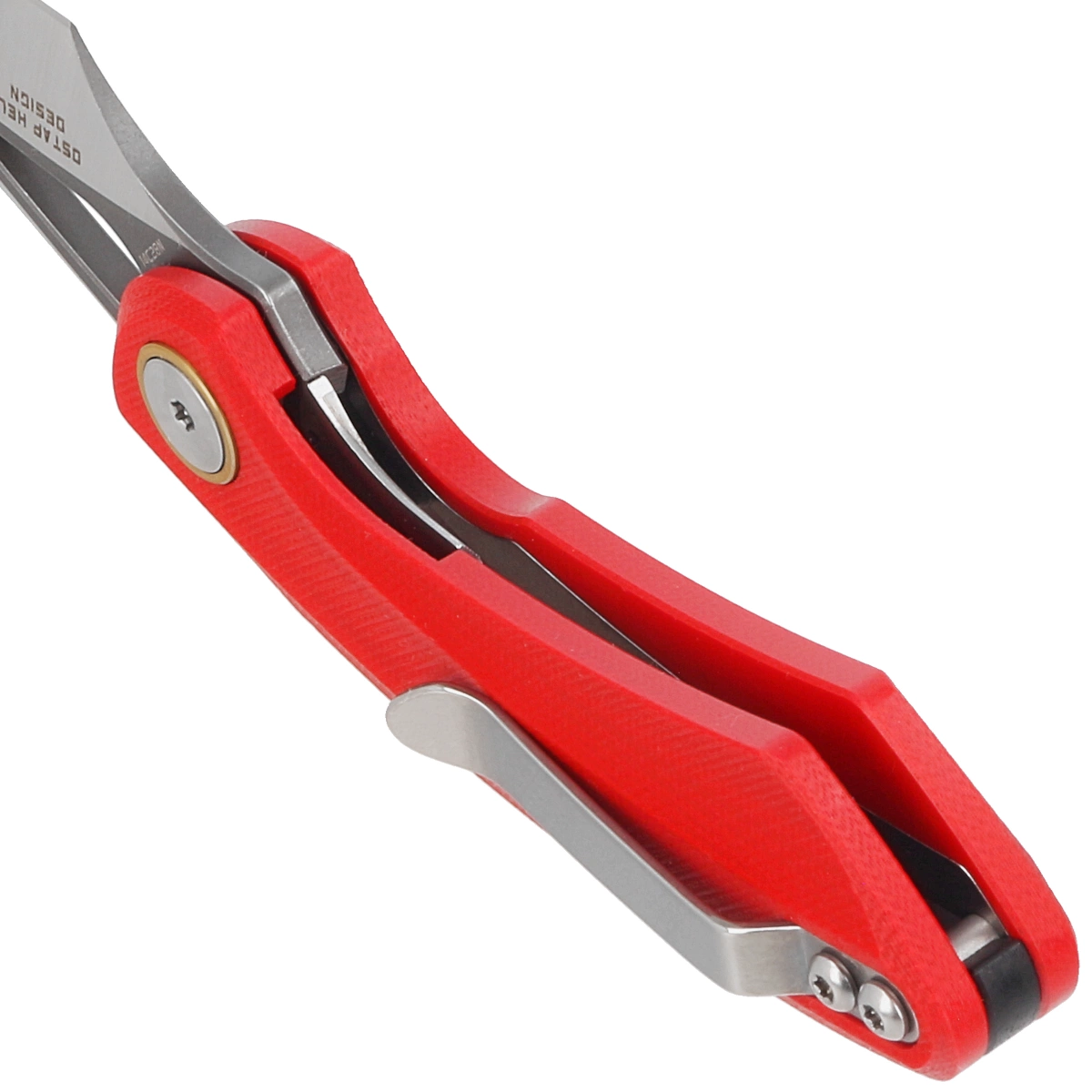 Bihai Red G10, Grey DLC Stonewash / Satin undersized EDC folding knife by Polish knife maker Ostap Hel. Aggressive blade modeled after the claws of a predator, G10 handle. Extremely lightweight with easy disappearance in your pocket or purse. Always with you!