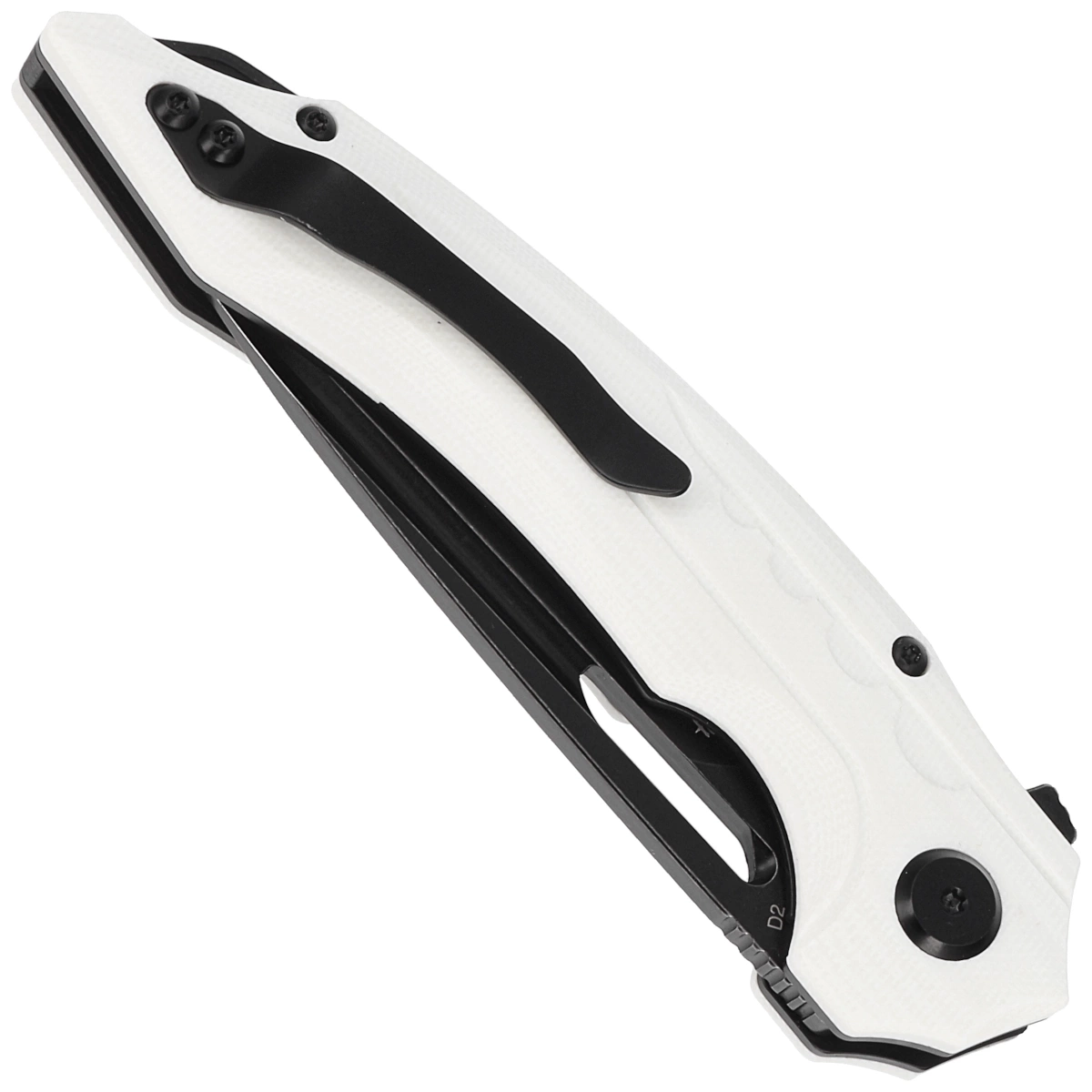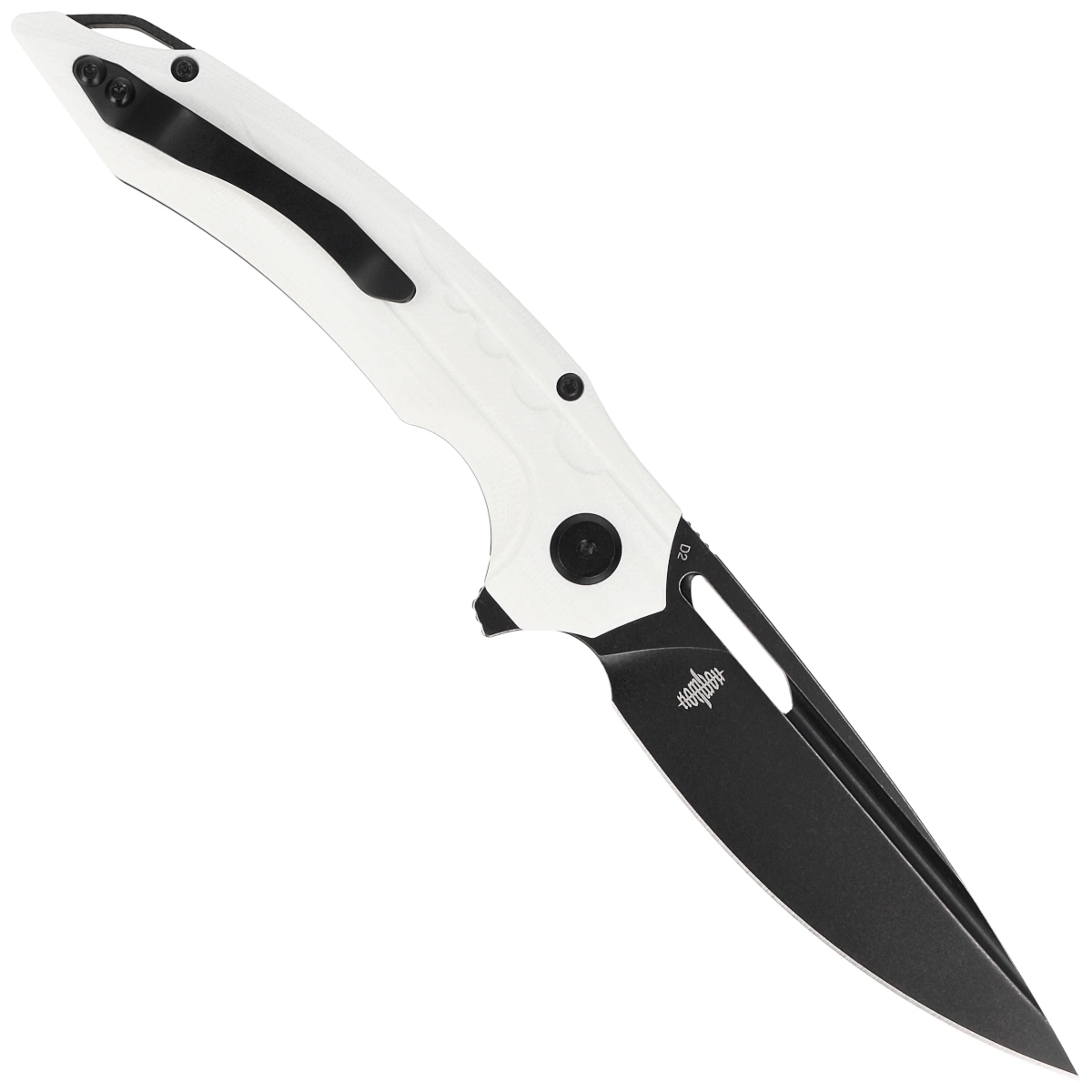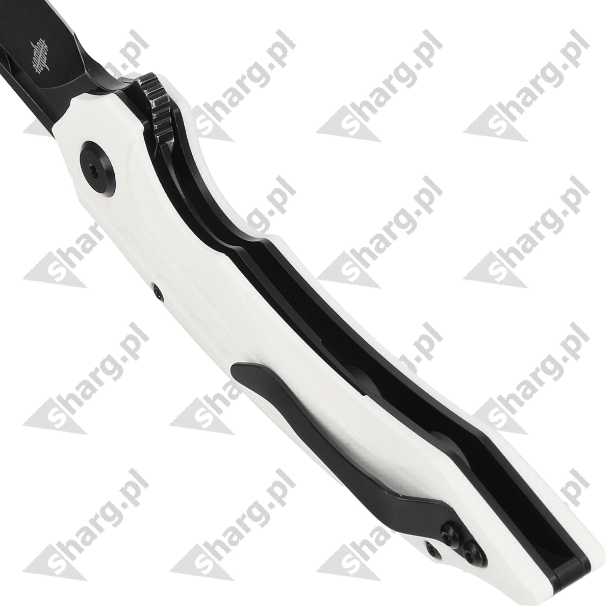 • Ornetta White G10, Black Stonewashed design by Grzegorz "Kombou" Grabarski. The blade with a refined grind line passing into a deep grain groove, thumb hole and flipper fin allow the blade to be opened in 3 ways. A bestseller!