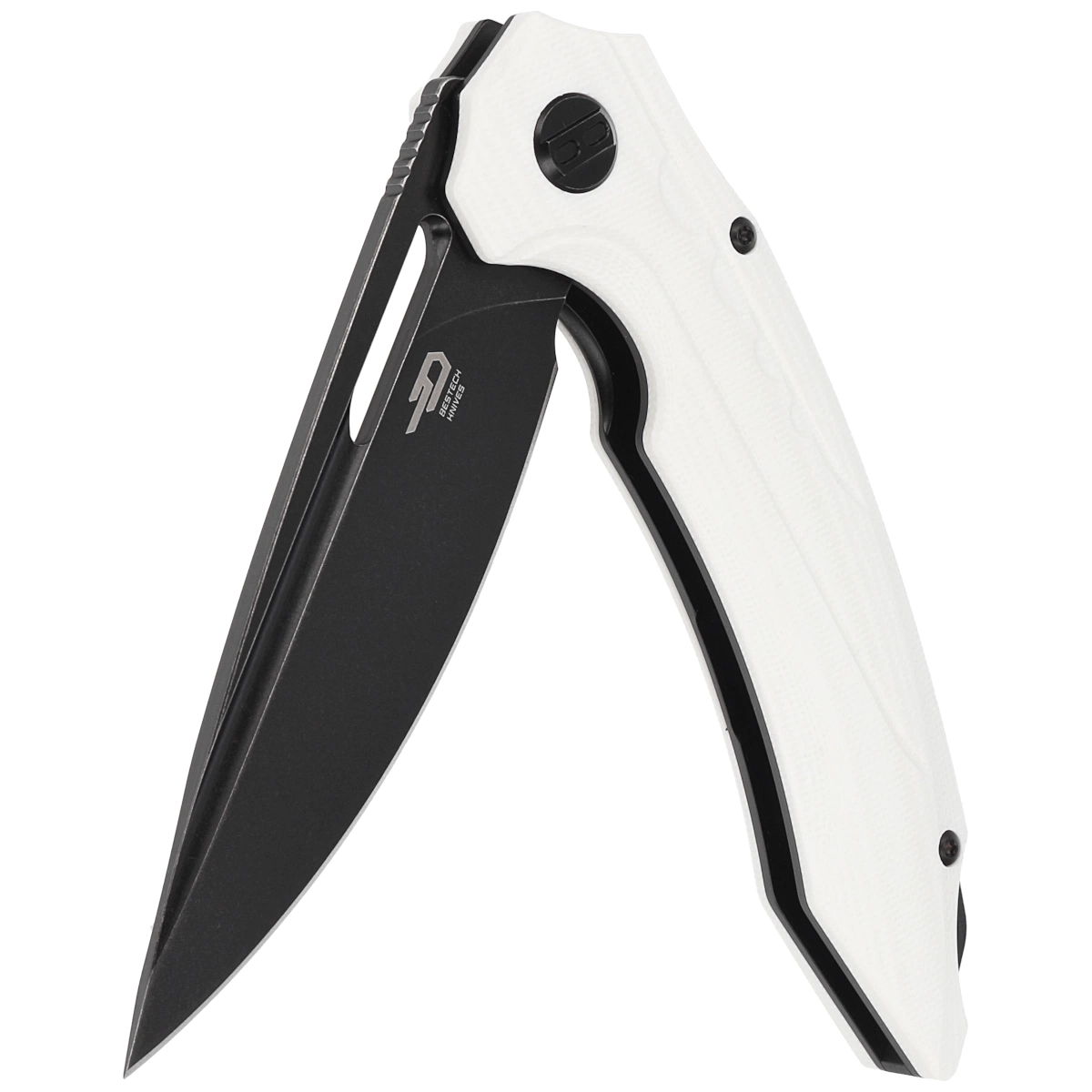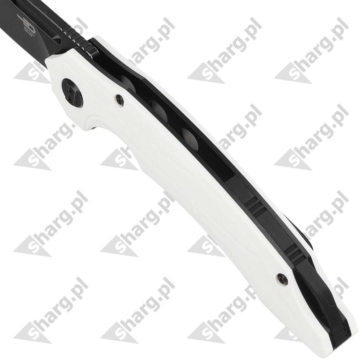 Handle - a strongly curved handle made of white G10 composite (pressure-pressed fiberglass with synthetic resin) provides an excellent grip in many positions. Chamfered cover edges eliminate sharp edges. Bolted to a solid steel backspacer, with a hole in the top for a safety or decorative cord. The pivot is decorated with a stylized letter "B". A single-position, right-side deep-carry clip allows you to carry the knife discreetly in your pocket in tip-up position (blade tip up). A fore finger groove improves grip security.