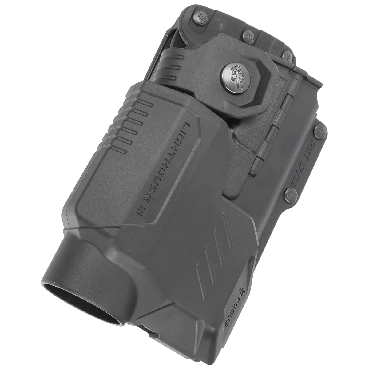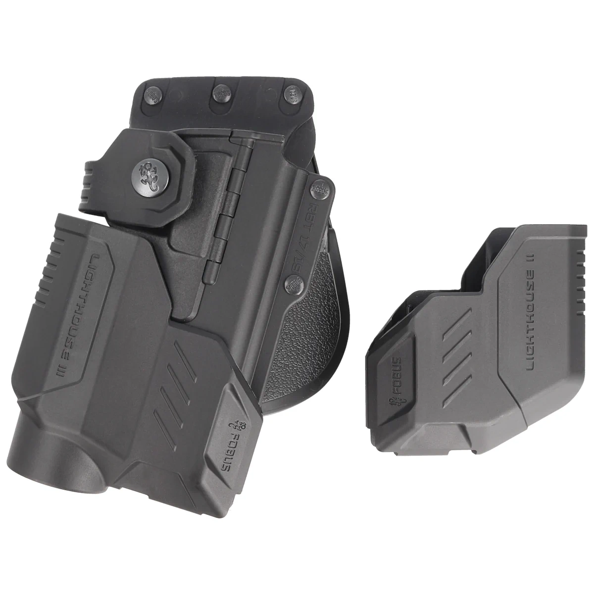 The RBT17G2 Bundle includes the RBT17G2 holster, as well as laser guards and flashlights, namely the LIGHTHOUSE II and LIGHTHOUSE III. The RBT17G2 holster provides passive weapon retention with a safety strap. The LIGHTHOUSE II/III laser guards and flashlights are designed for mounting and protecting various lasers and flashlights, eliminating lateral movement. They can be easily detached and folded.