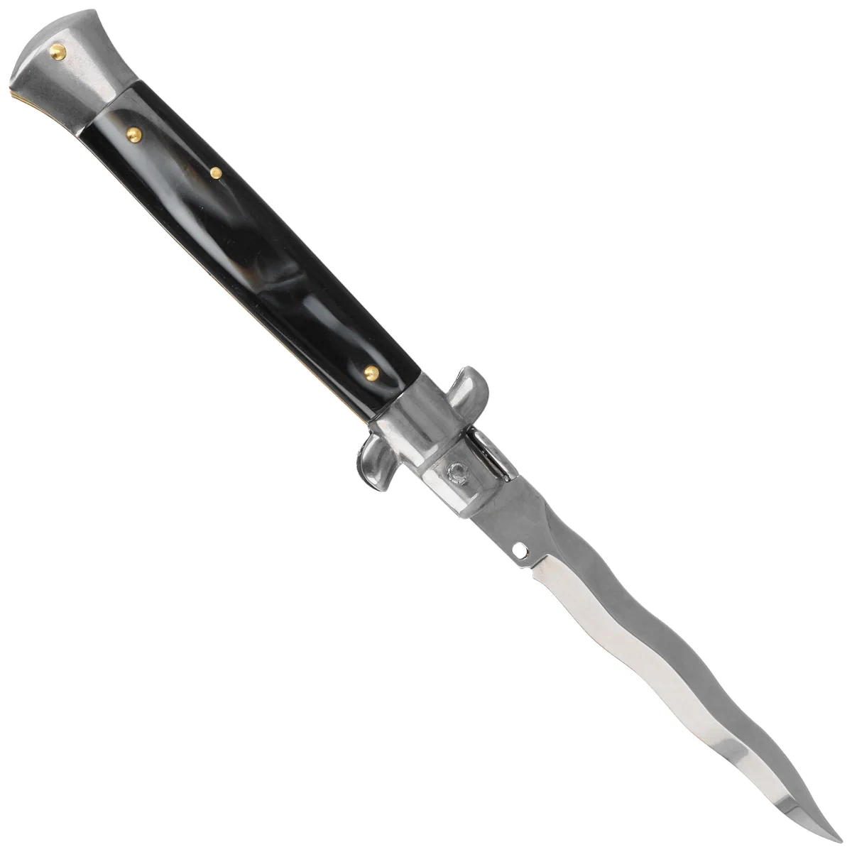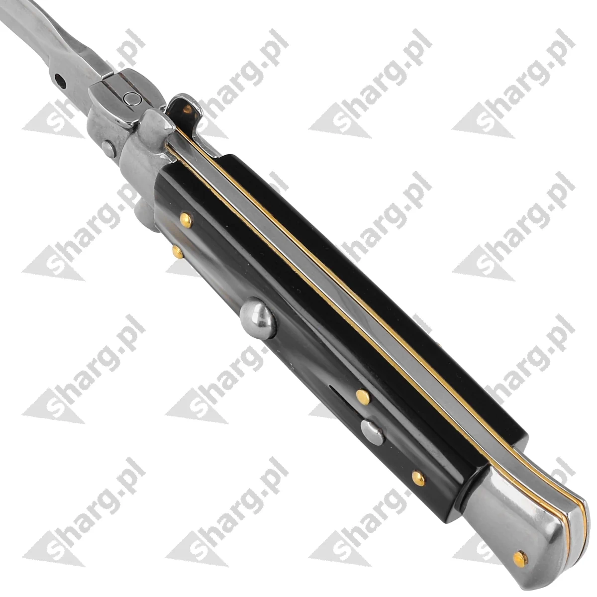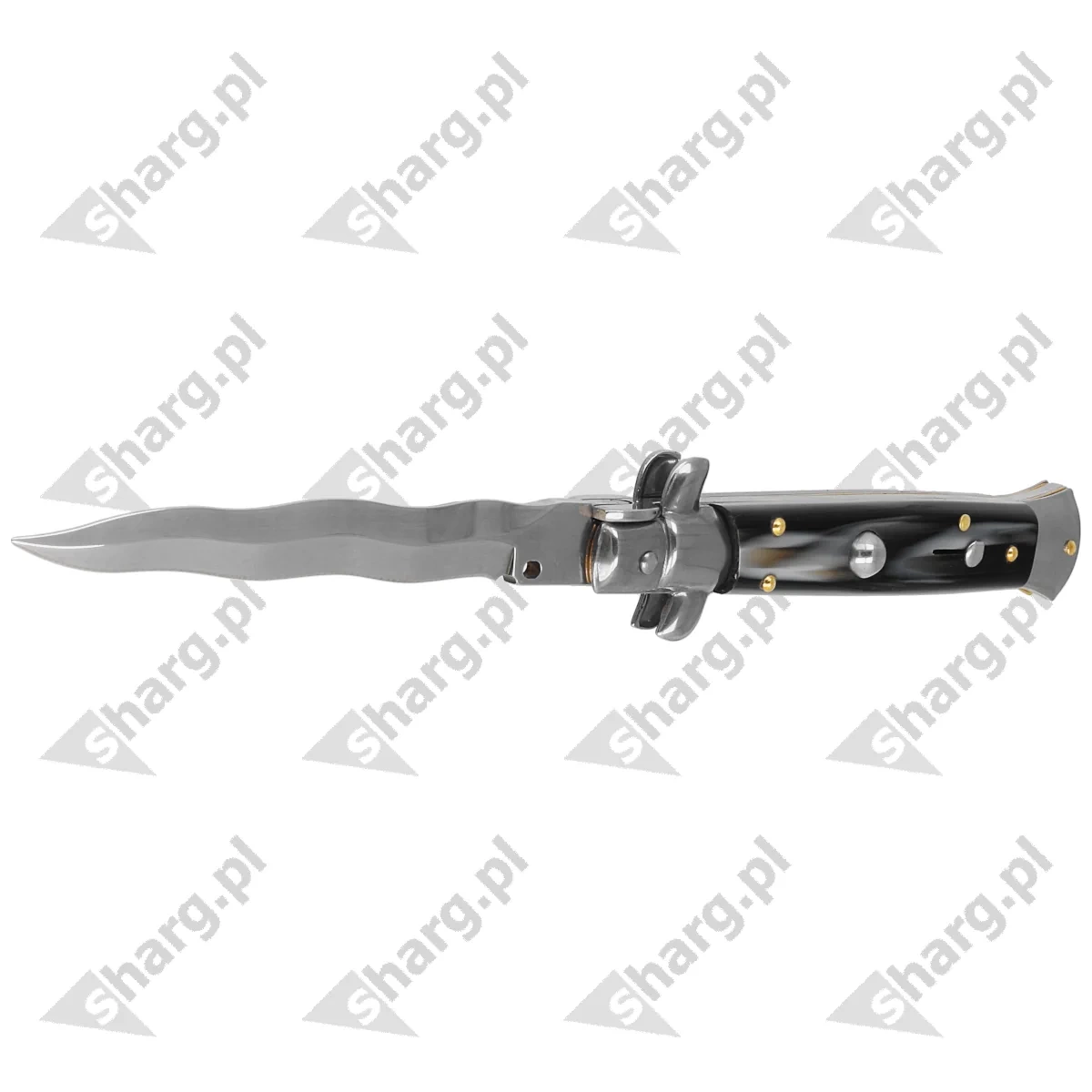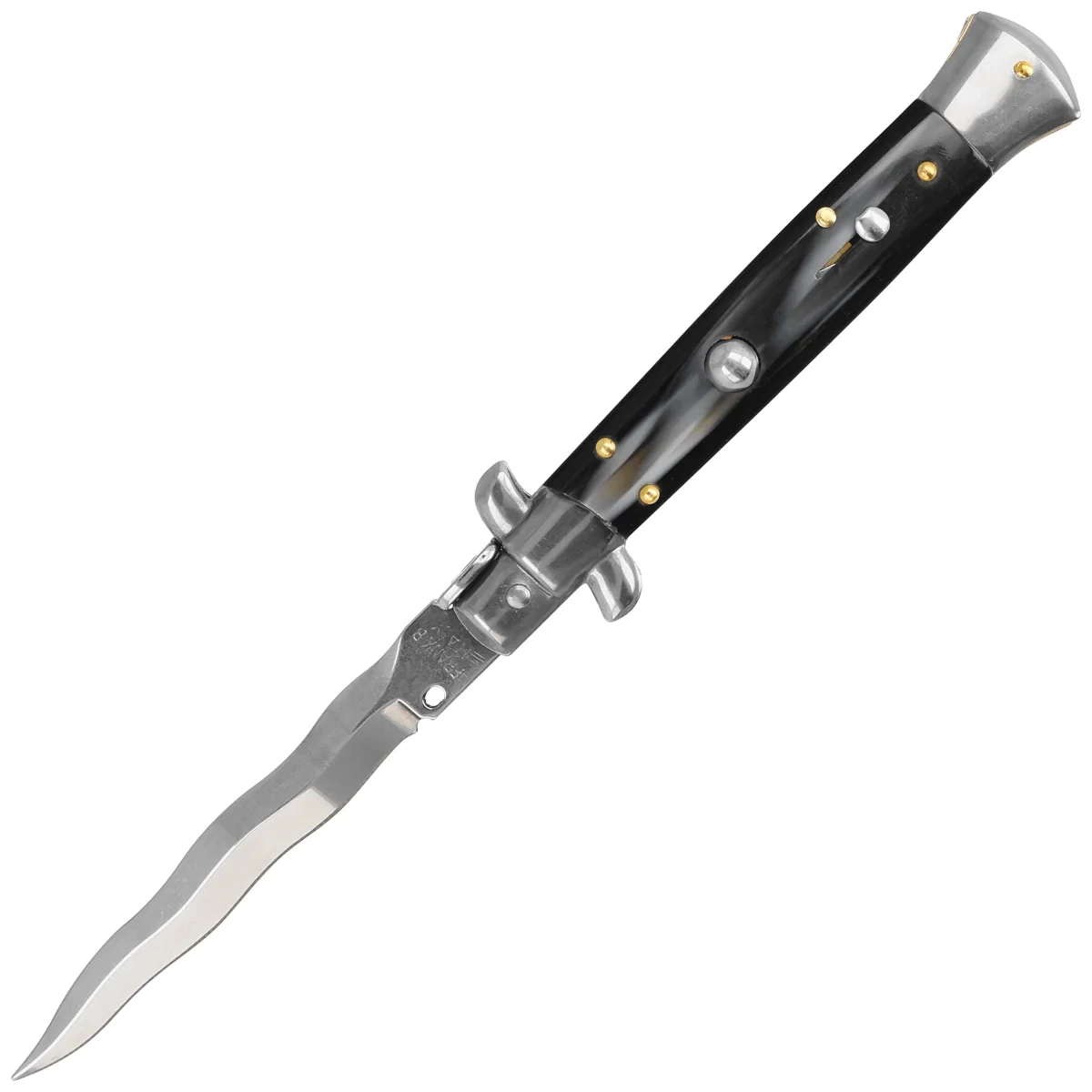 • Frank Beltrame Kris Black 23cm. Cult Italian spring knife hand-folded grips imitating buffalo horn. Folder when opening the hundredths of a second blade emits a distinctive click that distinguishes it from other spring knives