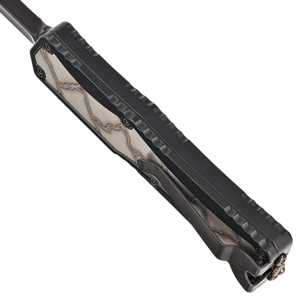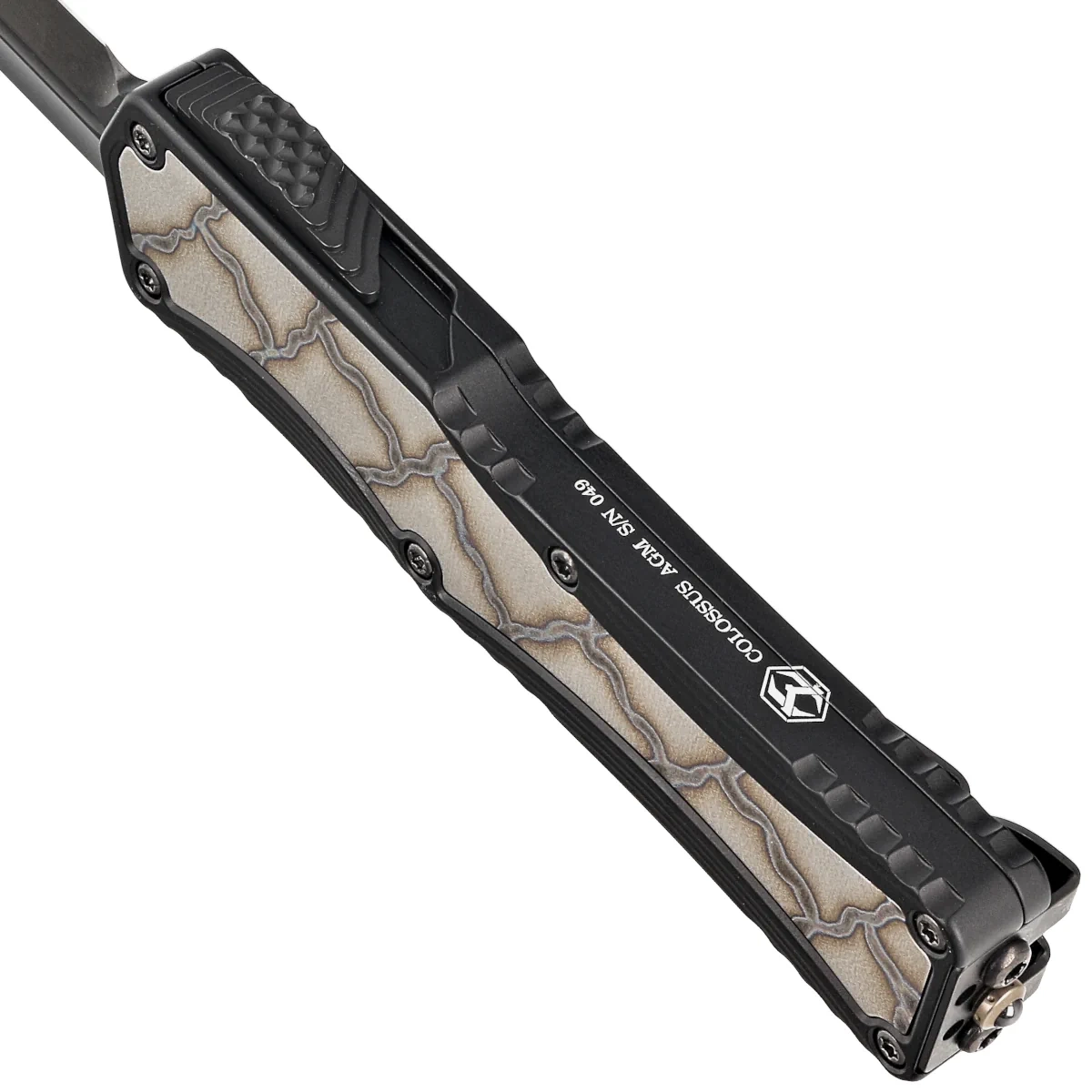 • Custom Colossus D/E Black Aluminum / Flamed Ti Inlay, Black DLC S/N 049. Automatic OTF knife operating in D/A (Double Action) mode with a slider to extend and retract the blade. Customised version by Anthony Marfione Jr., owner of Heretic Knives!