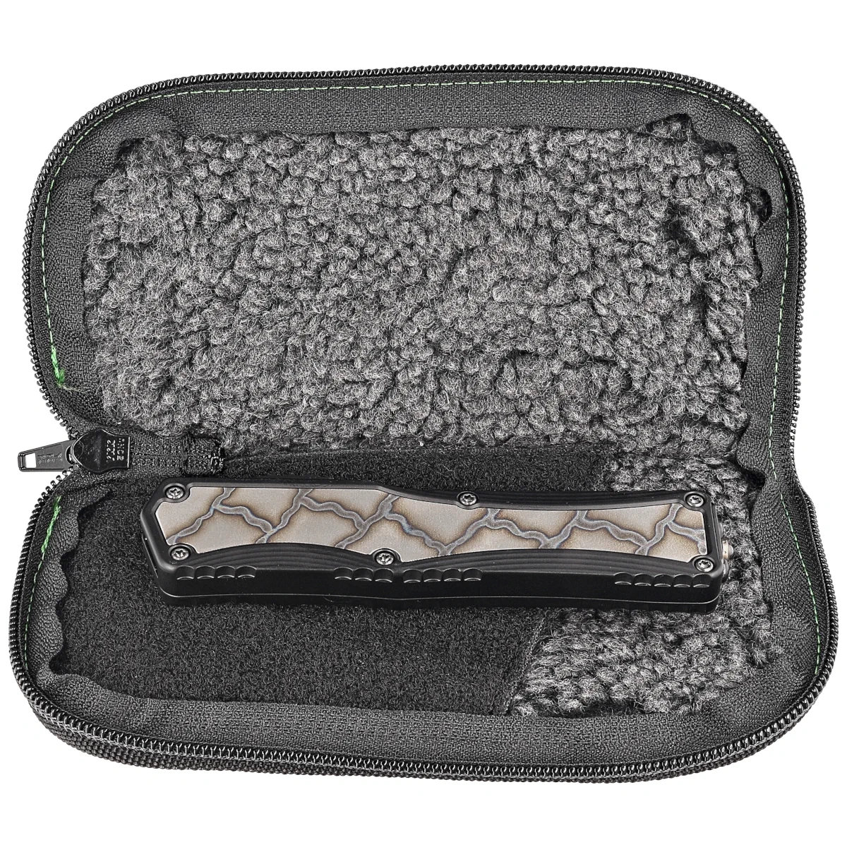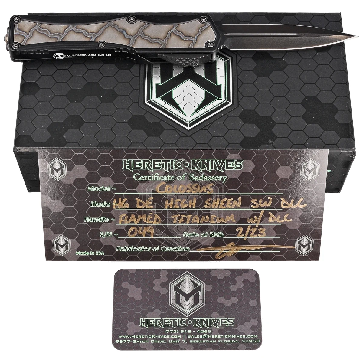Custom Colossus S/N 049 and date 2/23, has a secure place in the Heretic Knives OTF line of automatic knives. The mechanism, which operates with great strength and power, uses a patent-pending slide action. Ball bearings used reduce friction for fast, smooth blade locking. Grip enhancing inserts on both sides of the Handle give remarkable style as well as functionality. The double-sided clip makes this an ideal knife for right- or left-handed users.