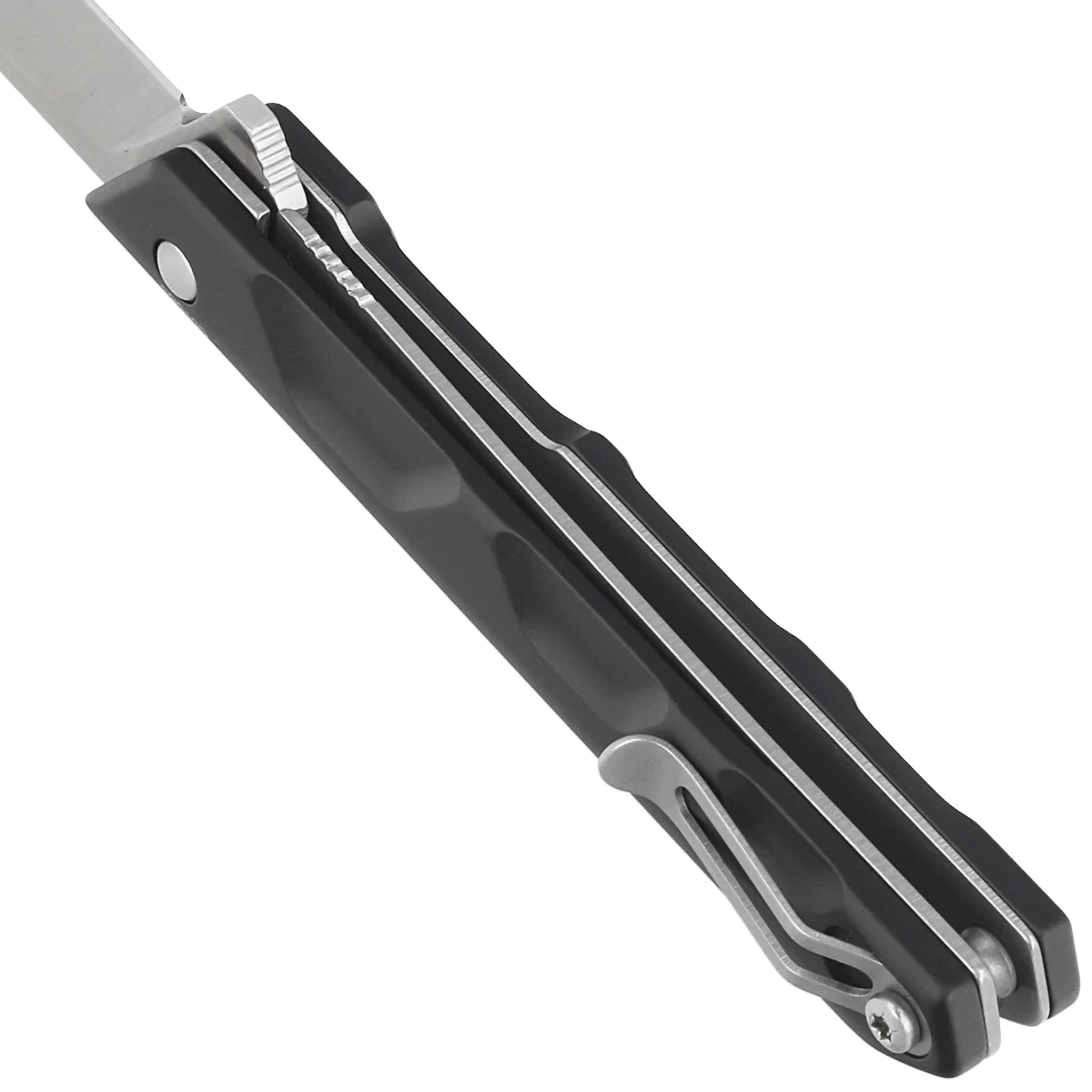 Handle - grips in anticordal anodized aluminium, screwed to a steel frame. The chamfered edges of the covers eliminate sharp edges and the finger recesses characteristic of Extrema Ratio improve grip security. The so-called open-backed construction without the typical backspacer, secured to each other by steel spacer sleeves, facilitates cleaning. The simple, robust construction provides the assurance of many years of use. The two-position (right/left) steel deep-carry clip allows you to carry the knife discreetly in your pocket in the tip-up position (blade tip up).