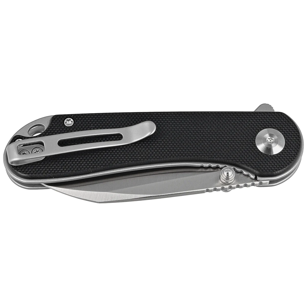 Handle - G10 plastic grips, textured in an intricate "3D cube" pattern (Textured Grabby G1) for improved grip security. The whole thing is attached to steel liners. In practice, this means many years of service without weakening the structure. The so-called open-backed design without the typical backspacer, attached to each other with steel spacers for easy cleaning in the field. The pivot axis is decorated with a stylized Civivi brand logo. A right-side metal deep-carry clip allows you to carry the knife discreetly in your pocket in tip-up (blade up) position. Above the clip a lanyard hole, an oval hole for a cord.