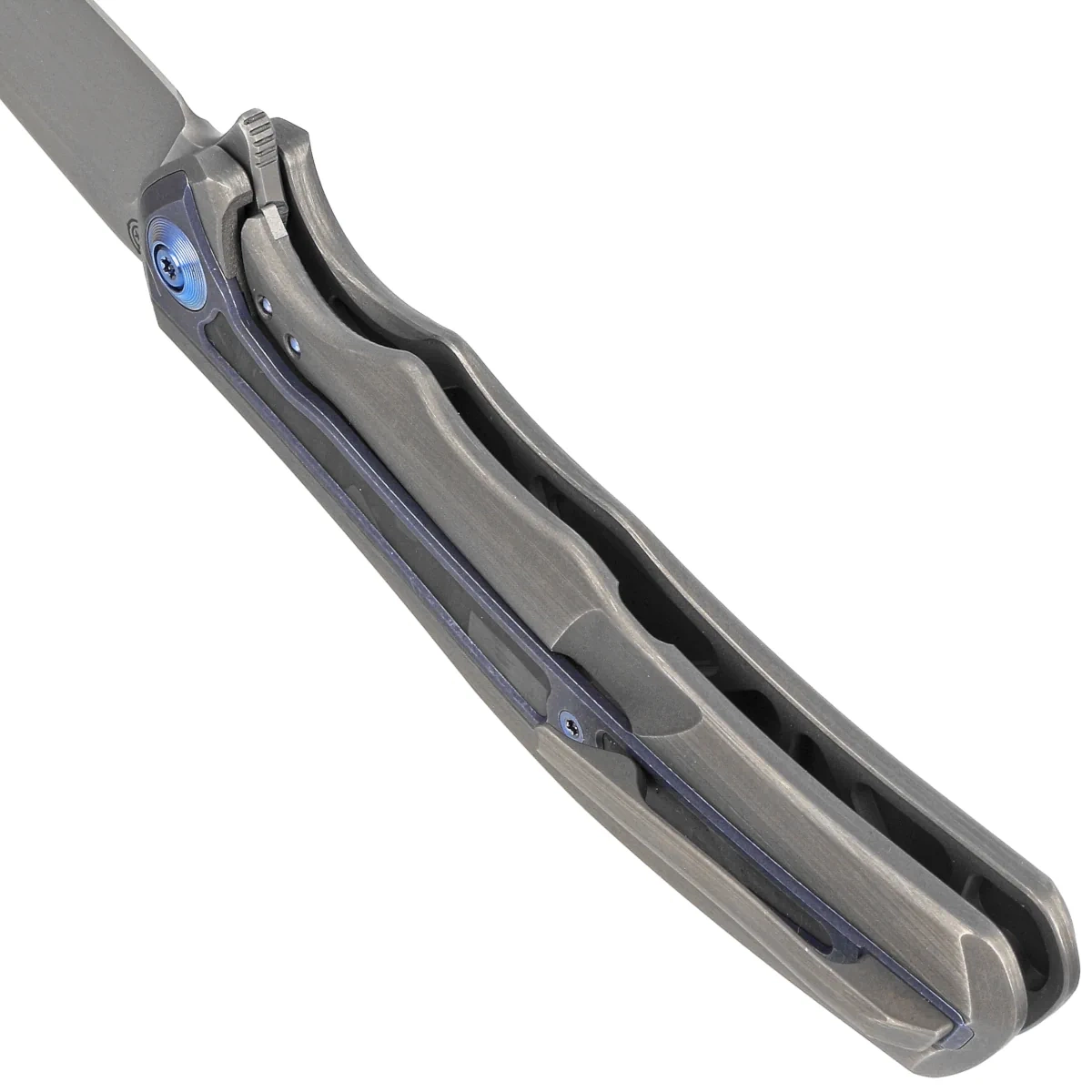 • Zonda Gray Hand Rubbed Titanium / Marble Carbon Fiber, Gray Hand Rubbed, the result of a collaboration between Kellen Bogardus and WeKnife. A striking EDC folding knife in CPM 20CV steel, with an integral backspacer.