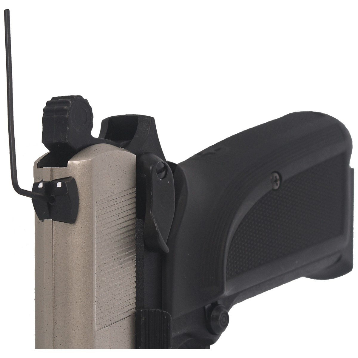Frame – made of hardened, lightweight polymer with an integrated Picatinny accessory rail (MIL-STD 1913). The combination of the polymer frame and fully metal slide gives the pistol a highly realistic appearance, nearly indistinguishable from a real firearm. It features a generously sized integral trigger guard for comfortable two-handed shooting. The grip panels are made of durable black ABS with a textured surface, ensuring a stable and secure hold.