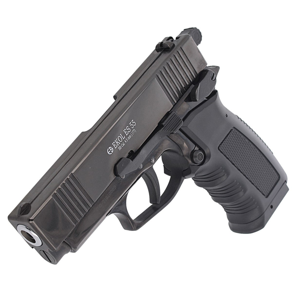 • Ekol ES 55 Black - airgun designed based on blank pistol construction. With such strong heritage, this powerful pistol, reaching a velocity of 140 m/s, is well-suited for dynamic shooting and tactical training.