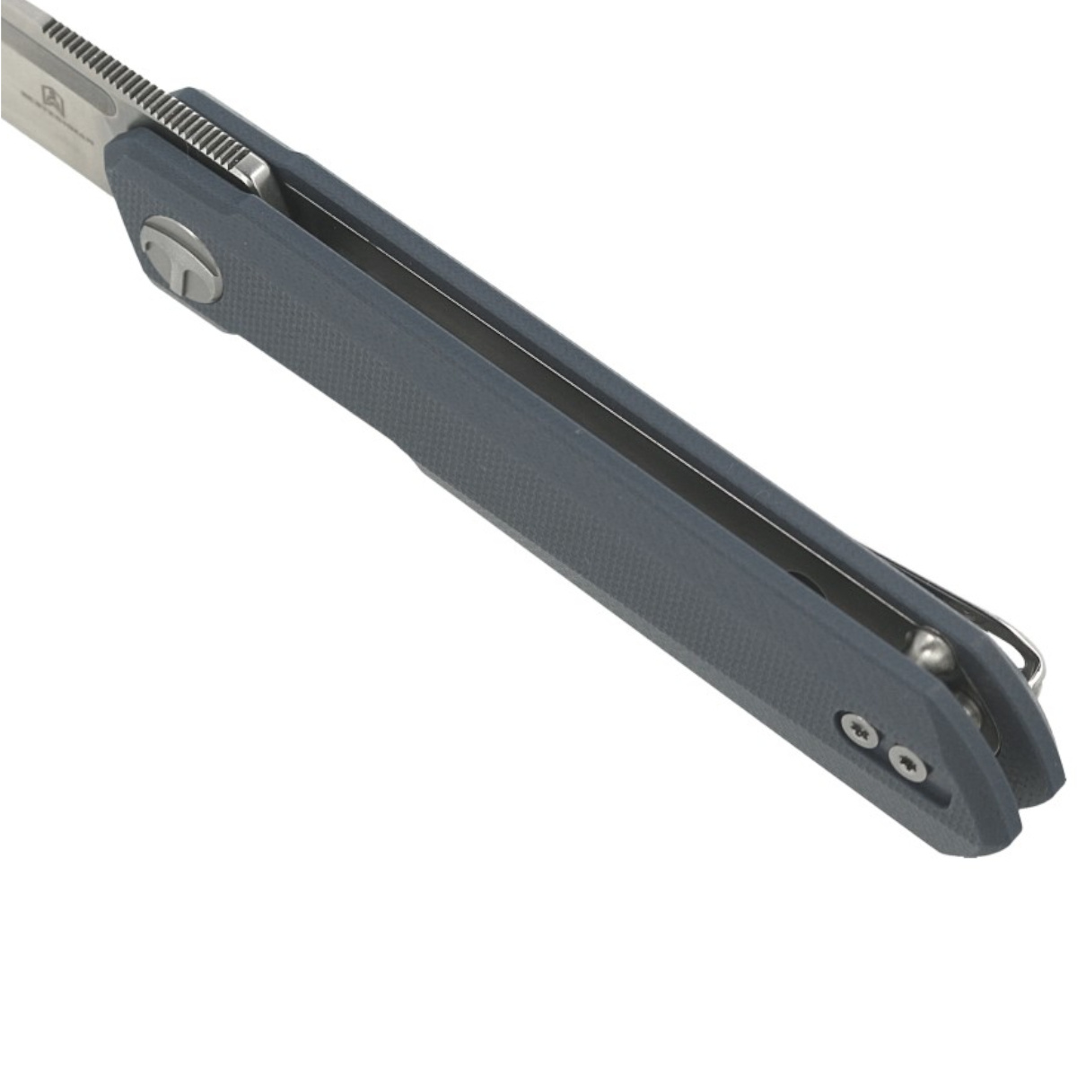 Handle - made of G10, a composite fiberglass material compressed with synthetic resin. The aggressive texture of the grips provides a firm grip, even with wet hands. The cover's chamfered edges eliminate sharp edges for comfort, and the finger indentation made on the front improves ergonomics. The open-backed design fixed with steel spacer sleeves reduces weight and makes cleaning easier. A two-position right/left deep carry clip allows you to carry the knife discreetly in your pocket in tip-up position (blade tip up).