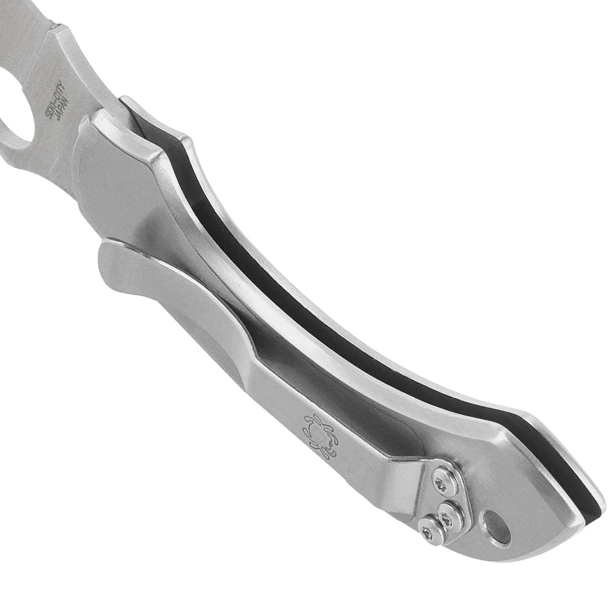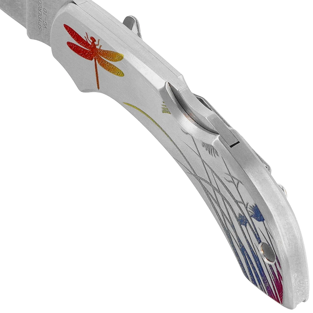 DragonFly Tattoo Stainless, Satin compact EDC folding knife with beautiful dragonfly engraving. Thanks to the excellent ergonomics of the grip and the ratio of the head to the handle, we get the impression of working with a larger folder. The knife's cutting capabilities are surprising compared to its petite appearance and innocent name DragonFly. A display of artistry from designer and founder of Spyderco, Sal Glesser!