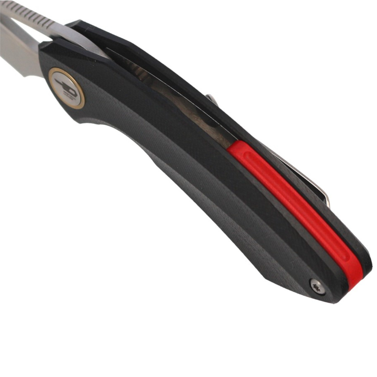Handle - grips made of black G10 (pressure-pressed fiberglass with synthetic resin) are bolted to a red backspacer, also made of G10. Contoured covers eliminate sharp edges for comfort and sure grip. The simple, secure design gives assurance of years of use. Single-position (right) steel clip allows the knife to be carried in tip-up (tip up) position.