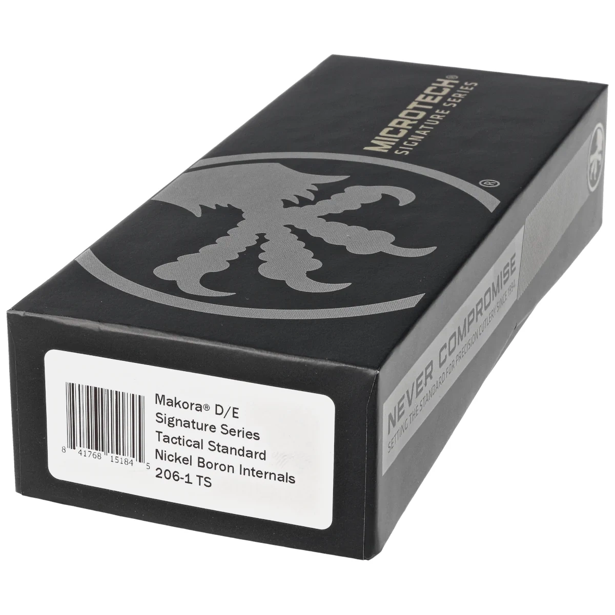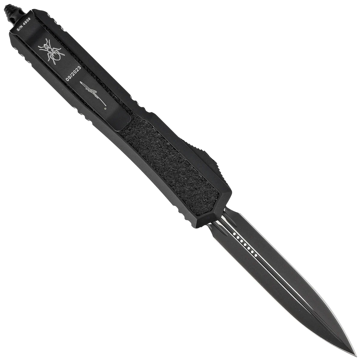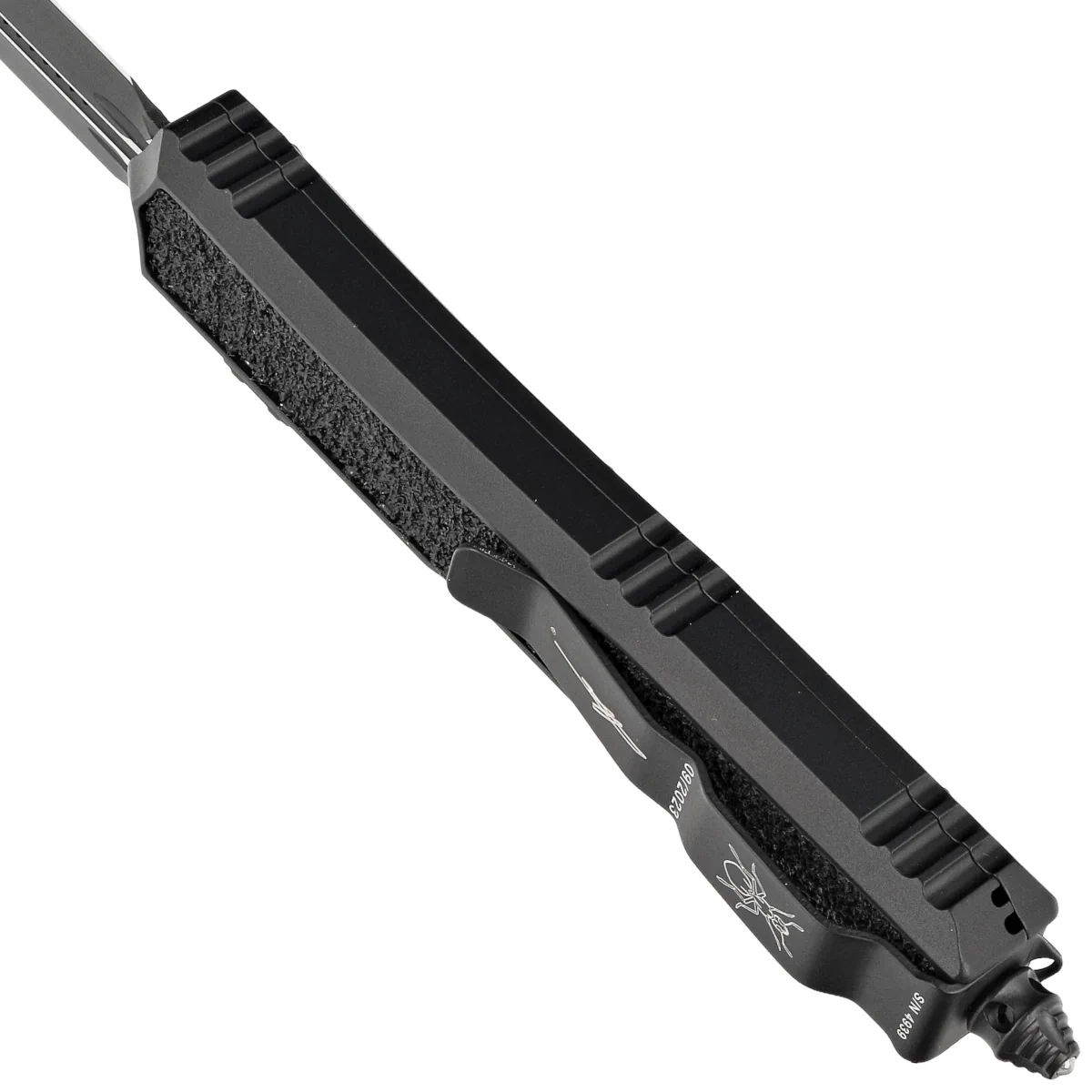 • Microtech Makora Signature D/E Black DLC Aluminium/Black Inlays, Black DLC is a full-size OTF automatic knife. Operating in D/A mode, it features a hell of a fast blade extension mechanism. Designed by Tony Marfione owner of Microtech Knives