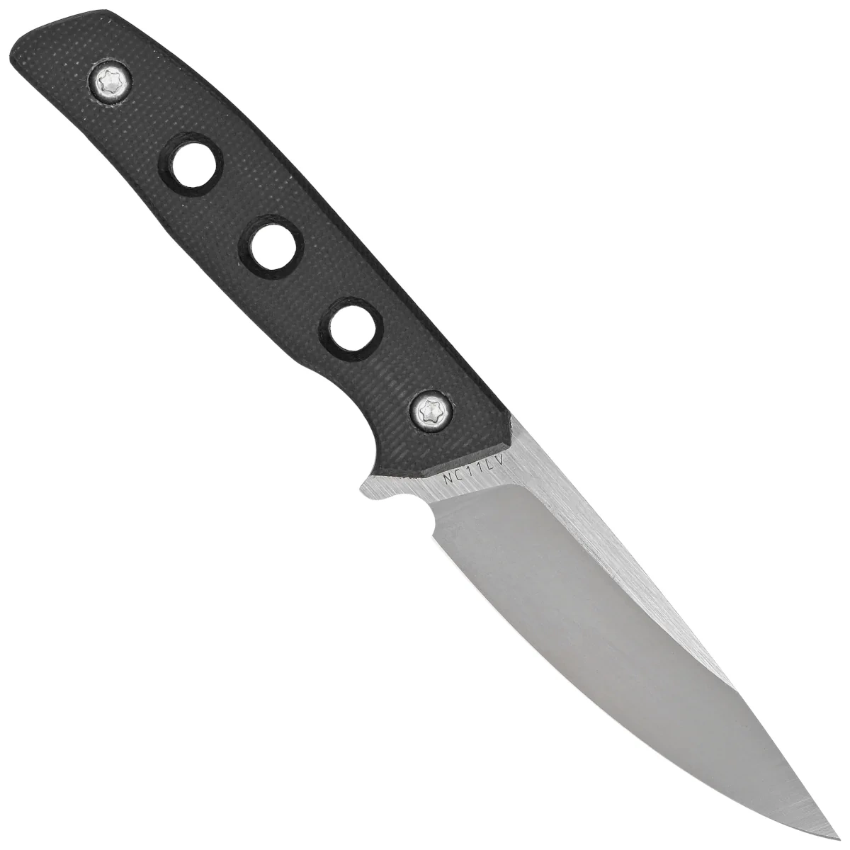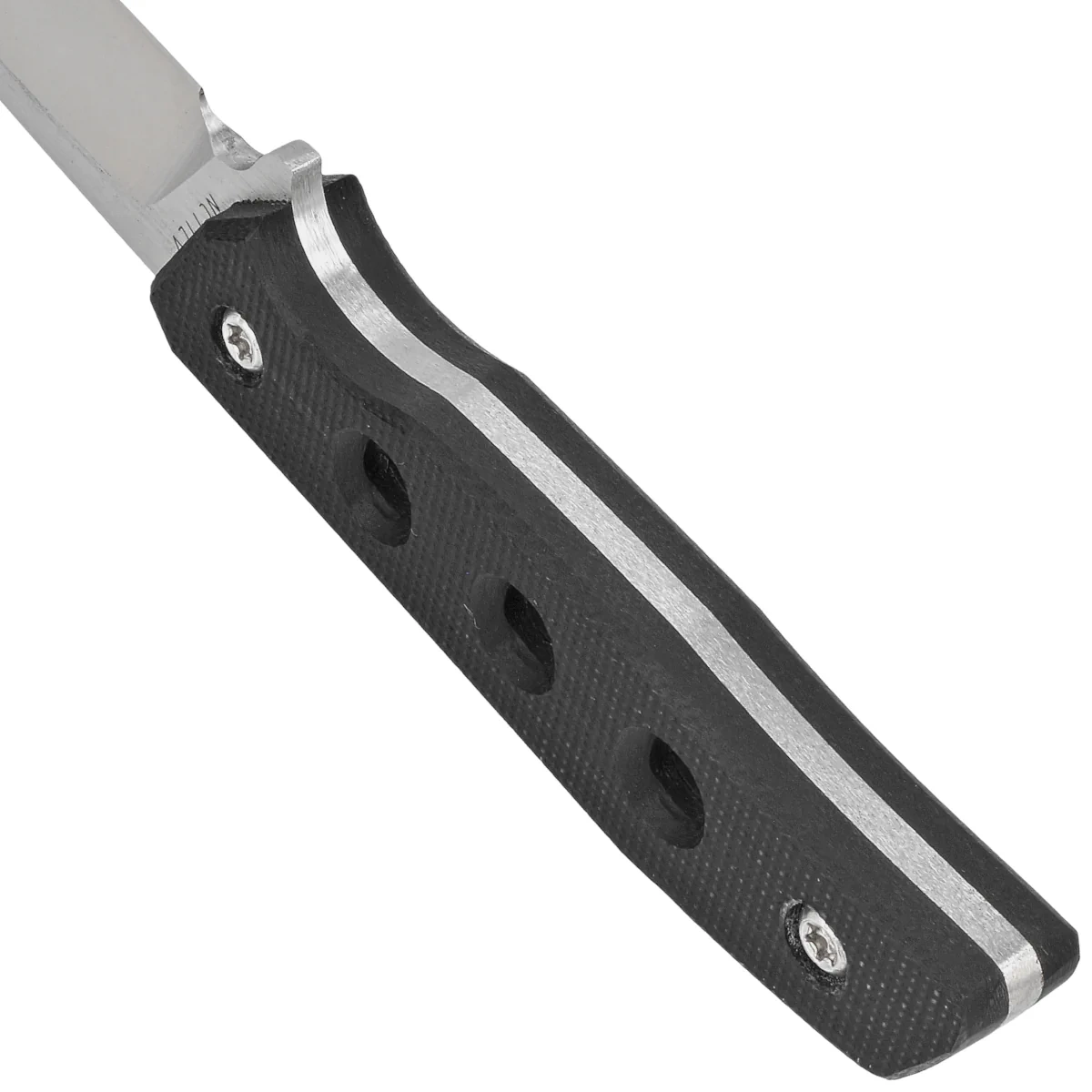 Handle - covered with durable G10 (fiberglass pressed with synthetic resin) grips in black, with a slightly rough surface. They provide excellent ergonomics and a secure grip. The symmetrical design of the Handle allows the knife to be held both ways, especially for users who appreciate an inverted grip. A series of holes not only visually gives lightness to the Handle, but also subtracts the real weight of the knife.