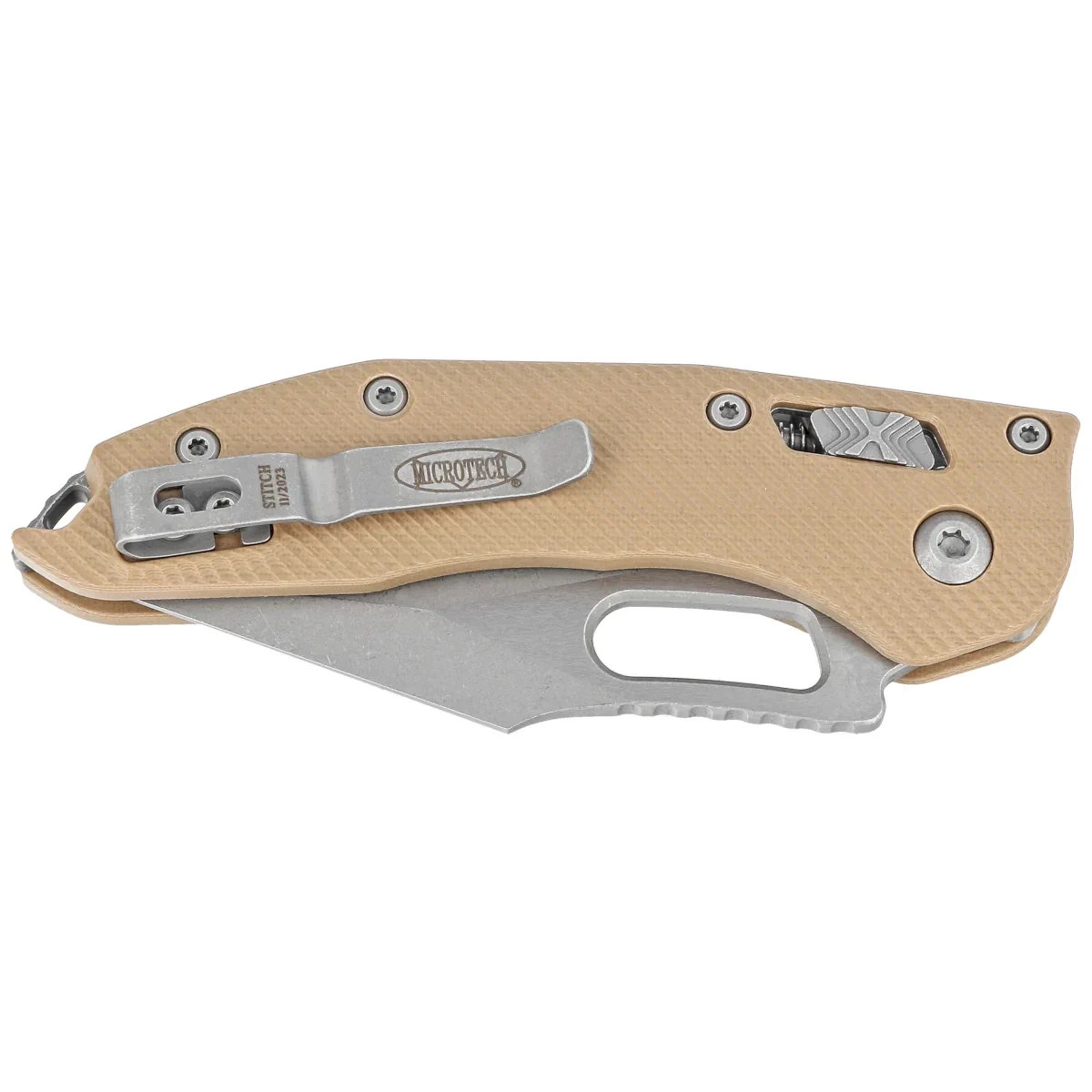• Stitch Ram-Lok S/E Tan Fluted G10, Apocalyptic manual version of the popular design by Sebastijan Berenjie of Borka Blades and Microtech. Wide harpoon-shaped blade, superior materials and legendary quality workmanship from Microtech Knives.