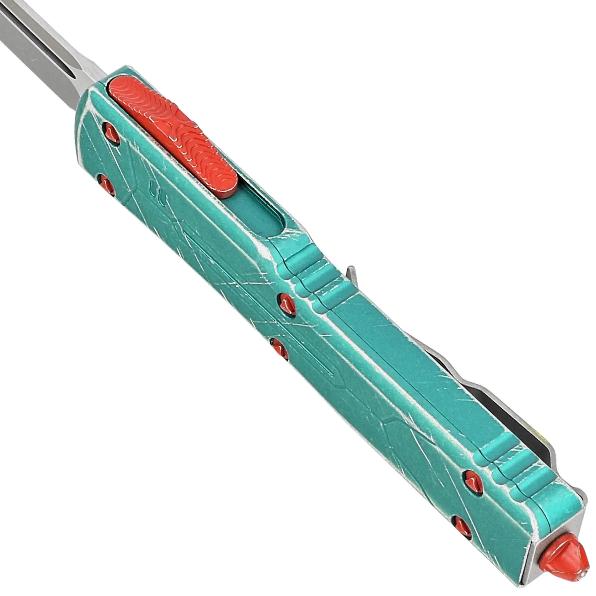 UTX-70 T/E Bounty Hunter Signature Distressed Green Aluminum, Apocalyptic OTF (Out The Front) automatic knife UTX-70 from Signature Series. It fully deserves to become part of the Mandalorian Bounty Hunter's equipment. The color scheme is inspired by the most famous Beskar armor belonging to the legendary Boba Fett. The Mythosaur skull symbol is a symbol of belonging to a clan of proud warriors! Equipped with a hellishly fast mechanism that extends a razor-sharp blade. 100% made and assembled in the USA.