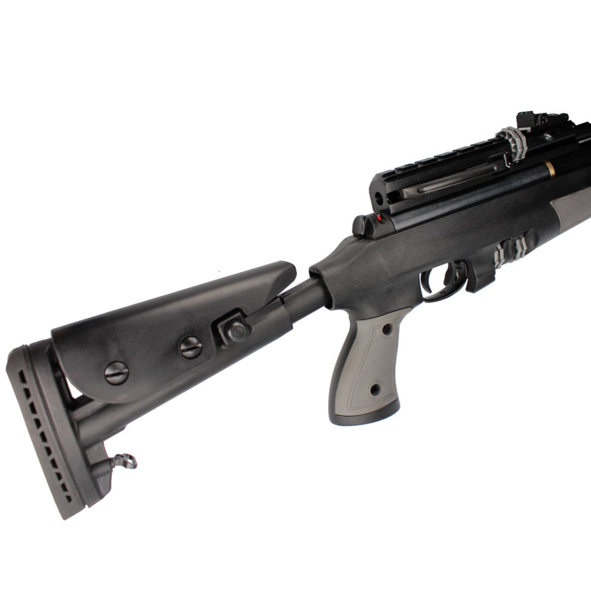 Mounting rail - double 11 mm / 22 mm, referred to as picatinny allows mounting of any optical sight. Equipped with a recoil-absorbing stopper after a shot is fired to prevent the sight from moving along the rail and calibrating it. Additional three rails picatinny on the rifle grip.