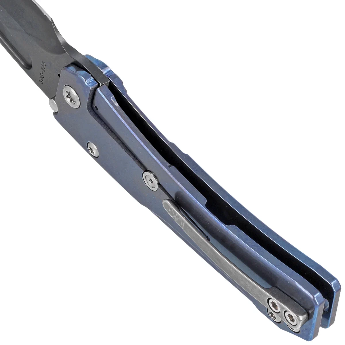 Handle made of titanium anodized in blue. On the back of the Handle a hole for interweaving a safety or decorative cord. The whole is complemented by a massive clip, also made of titanium, of course.