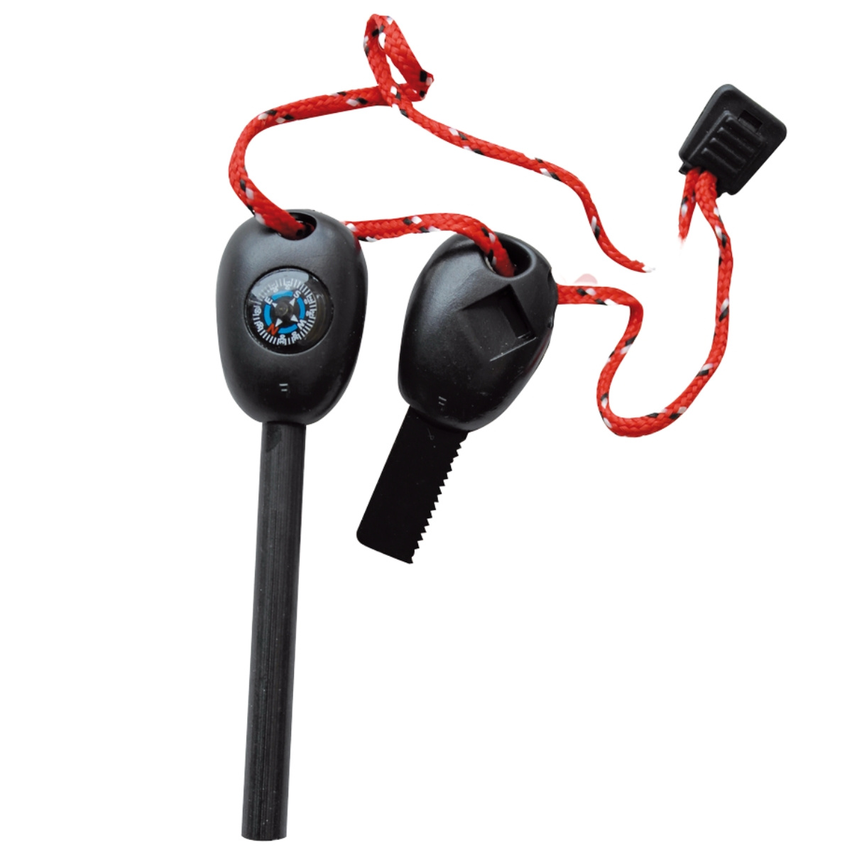 • Easy-to-use, all-purpose Fire Starter kit in black color. Equipped with a magnesium flint, signal whistle, mini compass, tape measure and universal mini saw. An essential piece of equipment for any survivalist.
