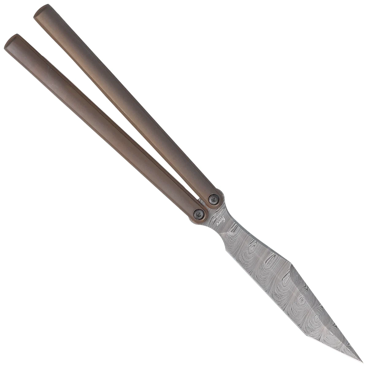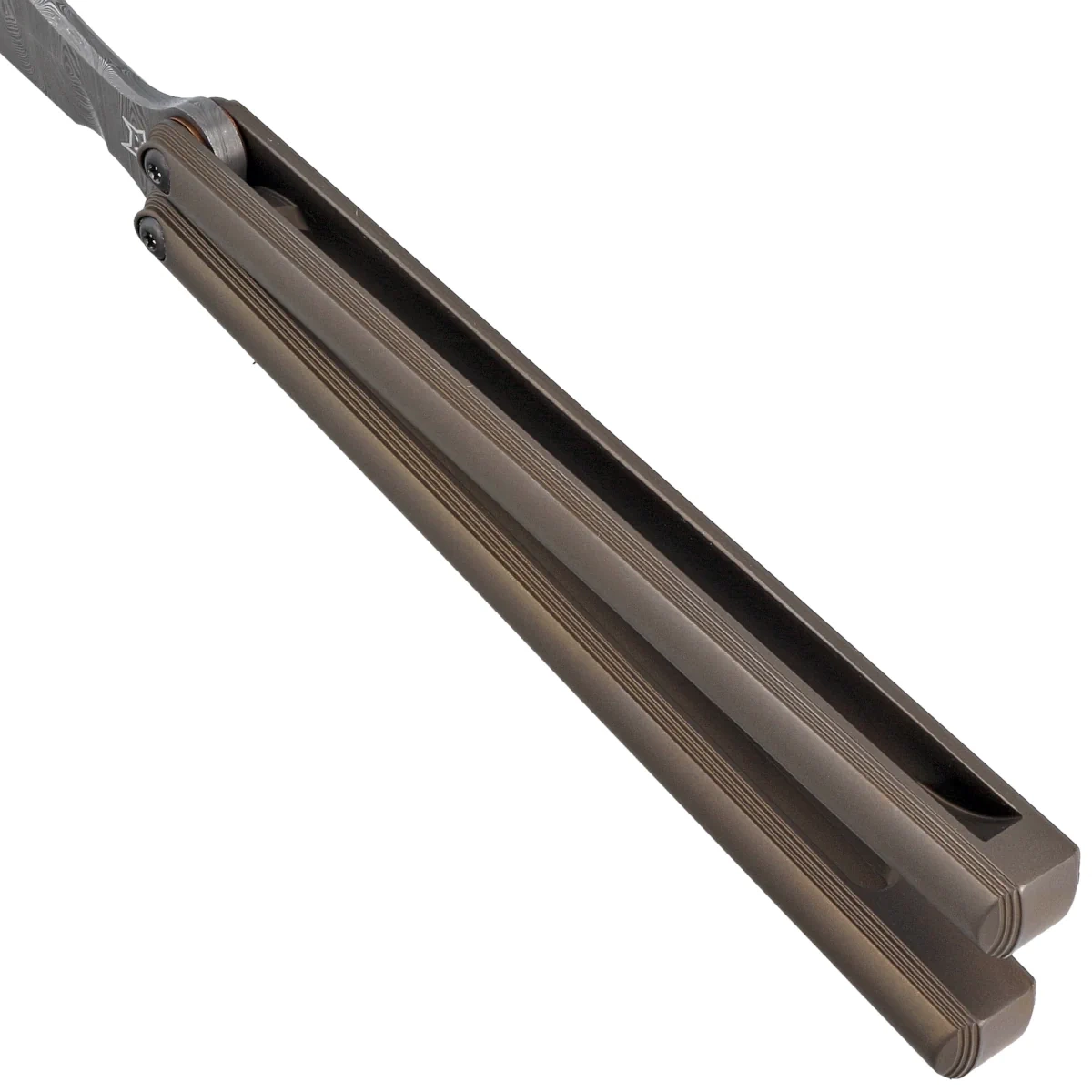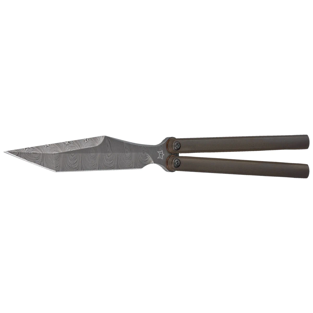 • PHI Butterfly Bronze Titanium, Damasteel Super Dense Twist, a design by balisong specialist Vincenzo Fiore for Fox Cutlery. Perfect form conducive to doing the most difficult tricks. Absolute top materials, anodized titanium, Damasteel® steel!
