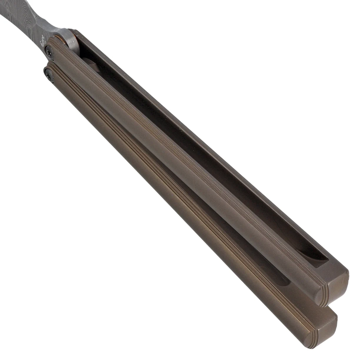 Handle - bronze anodized titanium grips with a slightly rough texture. Chamfered edges of the covers eliminate sharp edges. Pivot axes set extremely close to each other due to the lack of stop pins. Such a solution allows for much smoother operation, making it easier to perform complex tricks. For the same reason, the designer dispensed with the bar that secures the arms in the open position, on the assumption that the main purpose of his balisong is to provide fun,