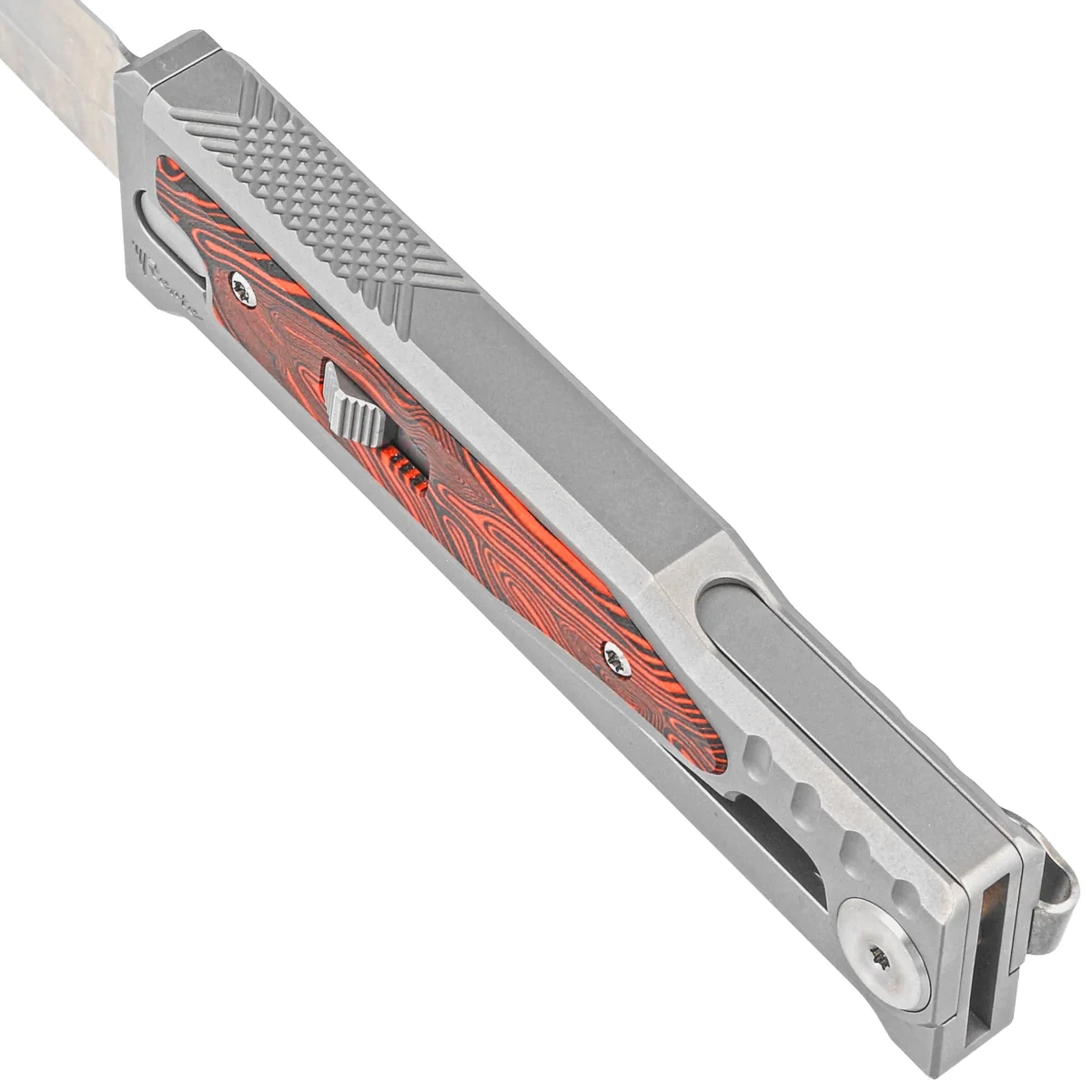 Handle - CNC-milled titanium Exoskeleton, an external skeleton with a movable top section responsible for opening and closing the knife. The chamfered edges of the sheaths eliminate sharp edges, and the perfectly matched G10 composite inlays in the unique Damascus pattern add an exclusive touch and improve grip security. On the right side, an artful sliding lock slider for advancing/retracting the blade. Once it is moved to the secure "lock" position, the knife will not be opened/closed by accident. A single-position titanium (right) deep-carry clip allows you to discreetly carry the knife in your pocket in tip-down position (blade tip down).