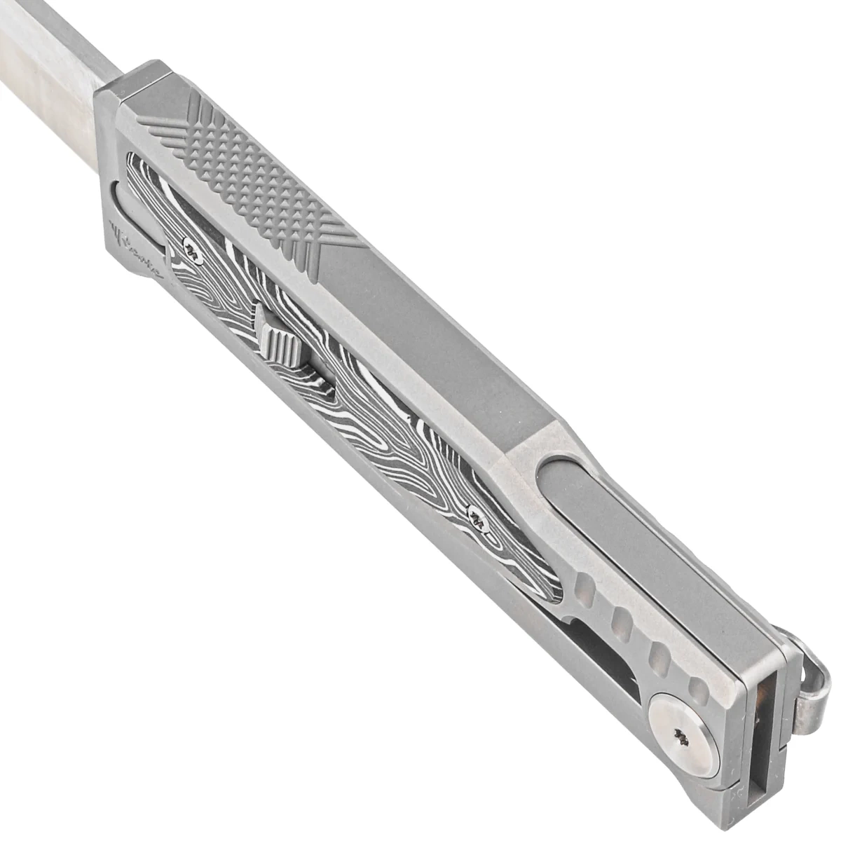 Handle – CNC-machined, titanium Exoskeleton construction. The external frame features a movable upper section responsible for opening and closing the knife. The chamfered edges of the sheaths eliminate sharp edges, and the perfectly matched G10 composite inlays in the unique Damascus pattern add an exclusive touch and improve grip security. On the right side, there is a finely crafted sliding lock slider for blade deployment and retraction. When shifted into the safe “lock” position, the knife cannot open or close accidentally. A single-position titanium deep-carry clip (right side) allows discreet pocket carry in a tip-down orientation (blade tip pointing down).