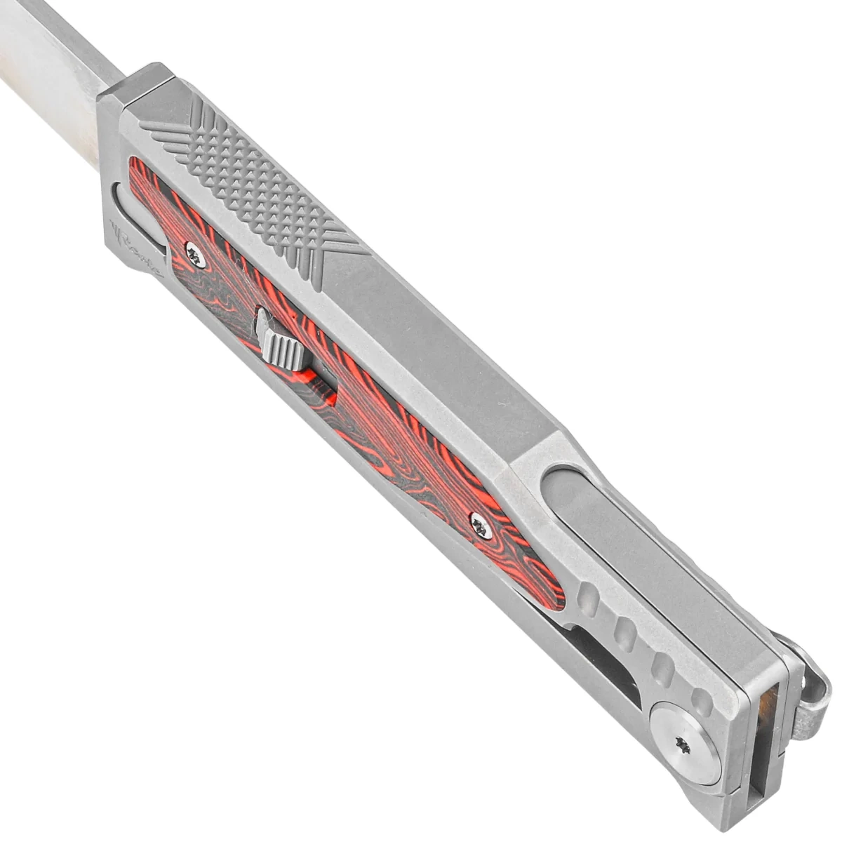- EXO-M Gravity Drop Point Bead Blast Titanium / Damascus Red-Black G10, Satin an ingenious knife from legendary Reate manufactory. OTF with an Elmax blade that extends due to the force of gravity. The best materials and intuitive opening.