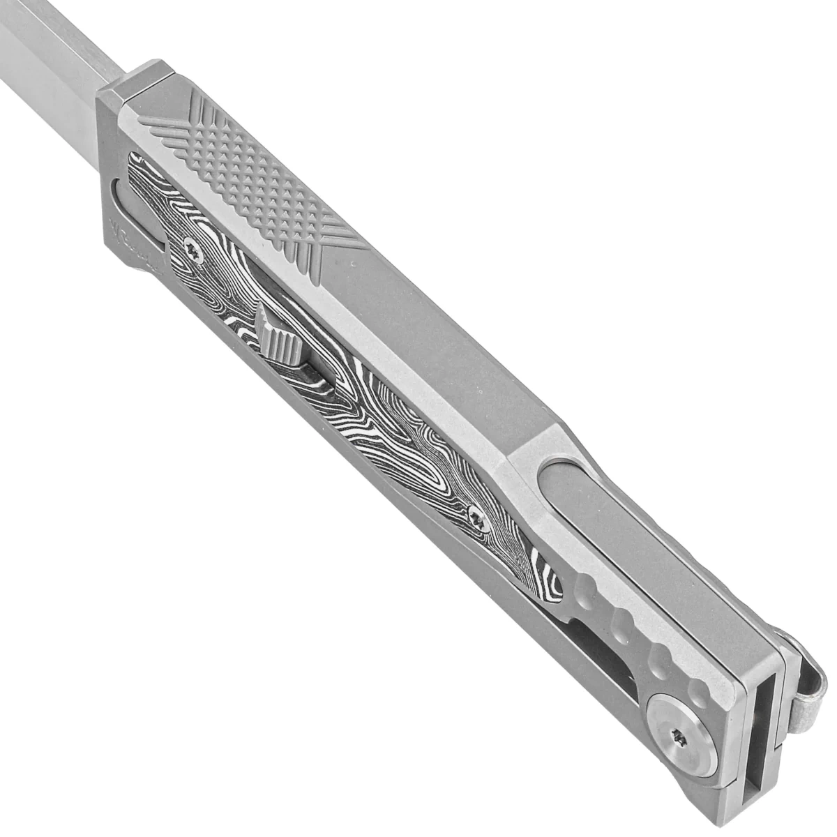 Handle - CNC-milled titanium Exoskeleton, an external skeleton with a movable top section responsible for opening and closing the knife. The chamfered edges of the sheaths eliminate sharp edges, and the perfectly matched G10 composite inlays in the unique Damascus pattern add an exclusive touch and improve grip security. On the right side, an artful sliding lock slider for advancing/retracting the blade. Once it is moved to the secure "lock" position, the knife will not be opened/closed by accident. A single-position titanium (right) deep-carry clip allows you to discreetly carry the knife in your pocket in tip-down position (blade tip down).