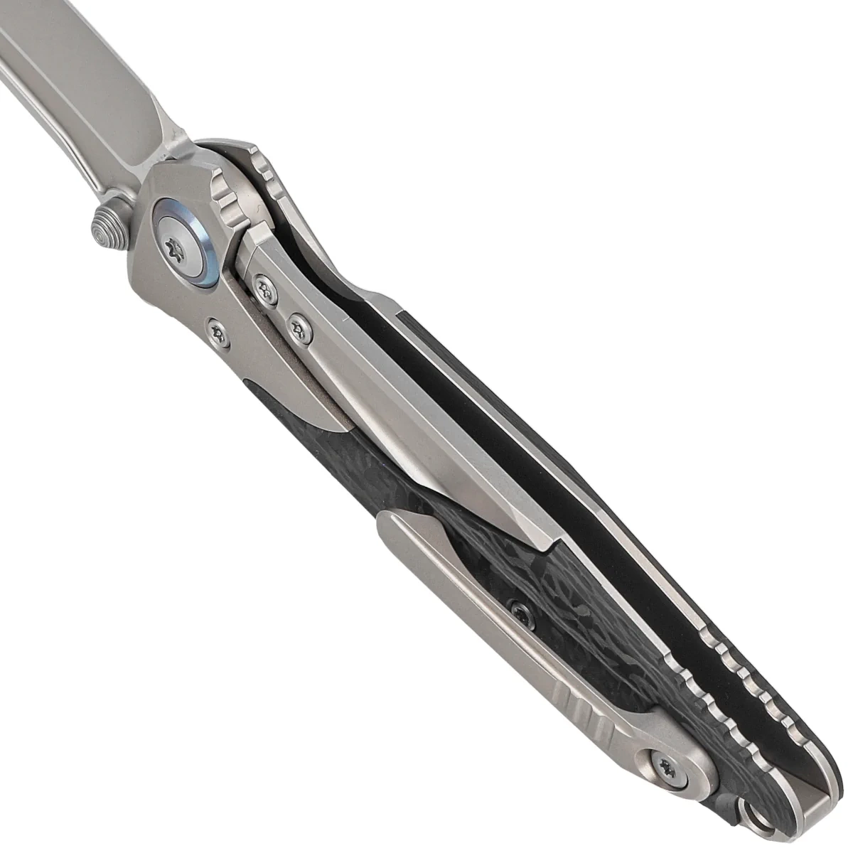 Handle - made with perfect precision in 3D technology on CNC milling machines from titanium. Perfectly fitted inlays (inlay) of Carbon Fiber composite make the knife does not slip in the hand during use. There are notches (jimping) on the back of the Handle for a more secure grip. The ergonomic profile and milled single-position (right) solid clip, allow the knife to be carried discreetly in the pocket, in tip-up(blade tip up) position. The pivot axis decorated with a blue rim (pivot collar cap). In the back there is a lanyard hole, a place for a safety or decorative cord. The protruding section of the titanium frame can be used as an improvised glass breaker.