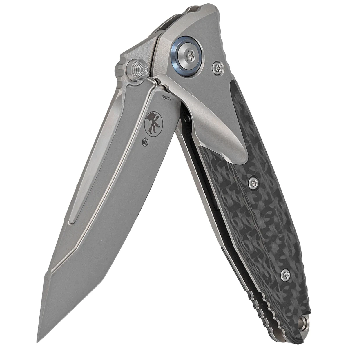 Microtech Socom Bravo Mini T/E Titanium/Carbon Fiber, Blue HW, Bead Blasted M390 by Tony Marfione (261M-7CFTI)
