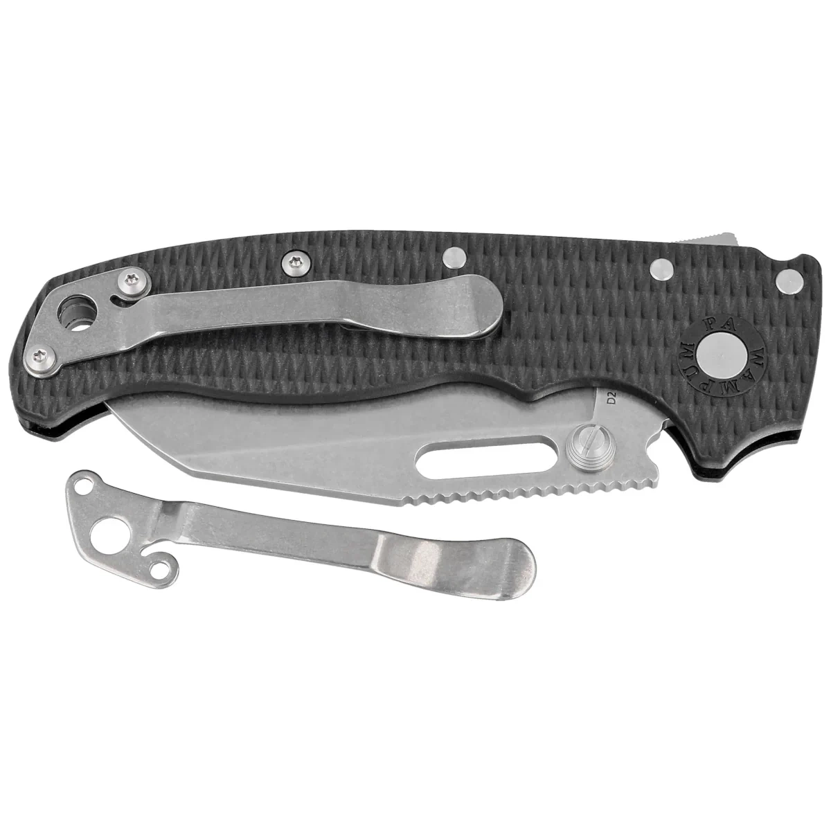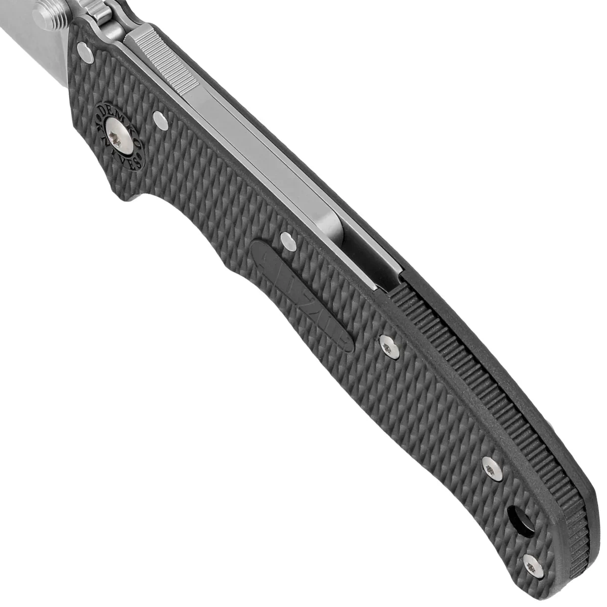 Handle - Grivory grips, a virtually indestructible plastic that is insensitive to weather conditions, resistant to chemicals and mechanical damage. The chamfered edges of the covers eliminate sharp edges and the characteristic textured surface improves grip security. A single-position, right-handed clip allows the knife to be carried in the tip-up position, with the tip of the blade upward. A left-handed clip is included.