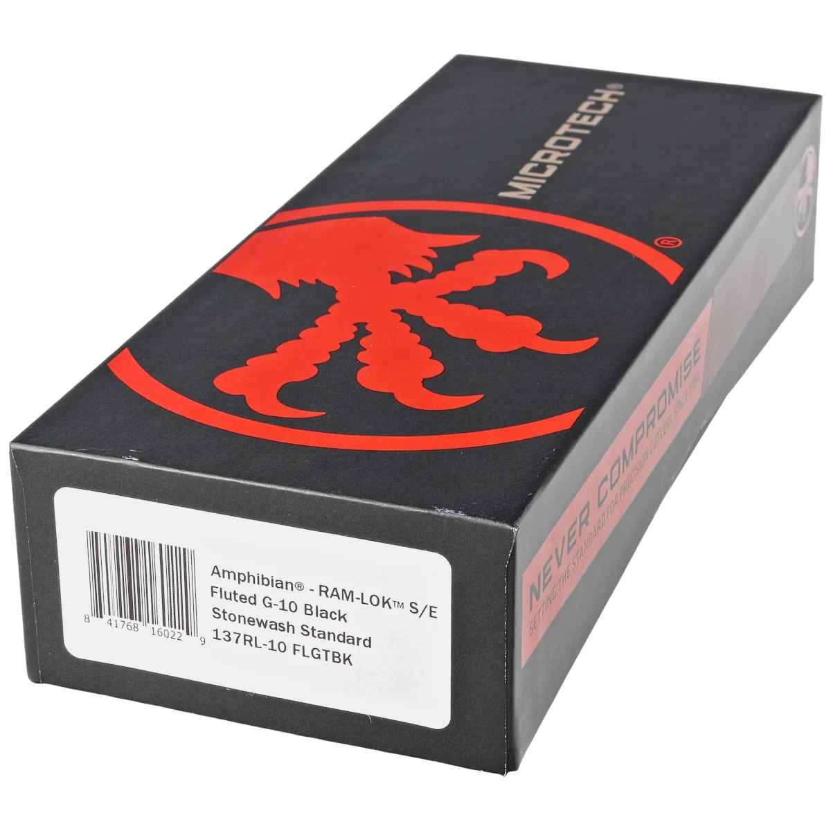 - Amphibian Ram-Lok S/E Fluted Black G-10, Stonewashed reissue of folding knife with intuitive RAM-Lock. Superior M390MK blade steel, the result of collaboration between Microtech and Bohler engineers. Ergonomic Handle. Designed Tony Marfione of Microtech